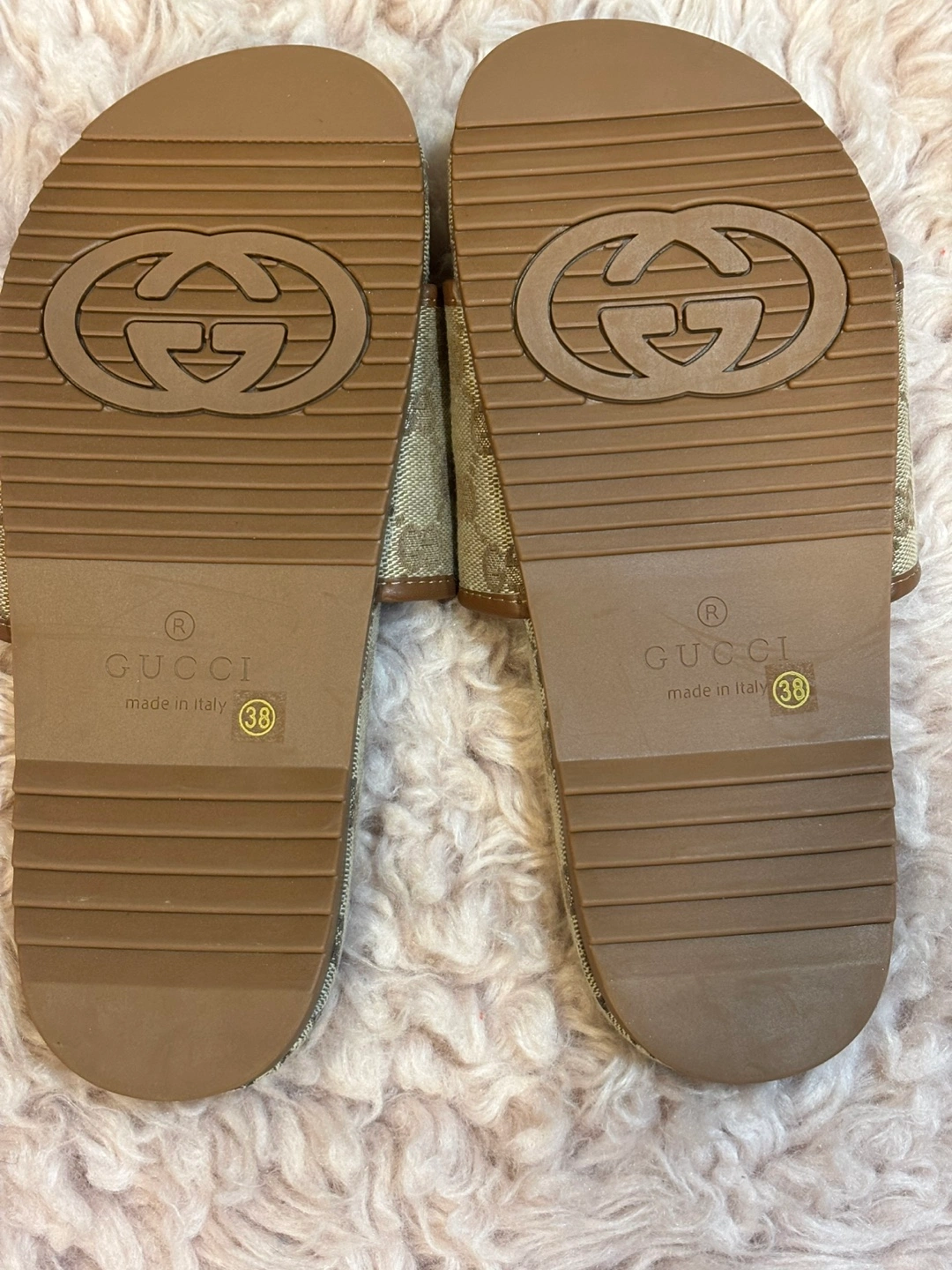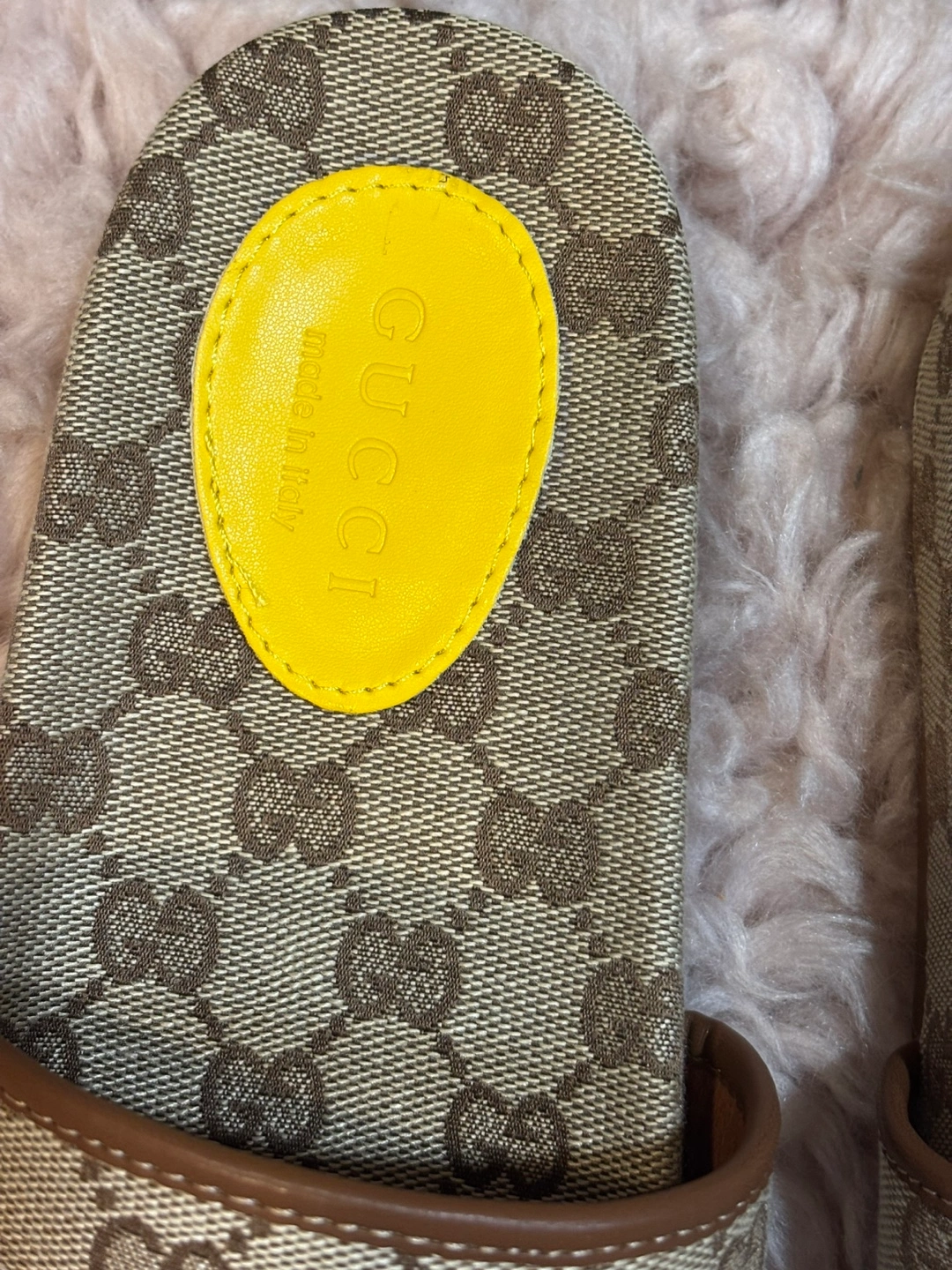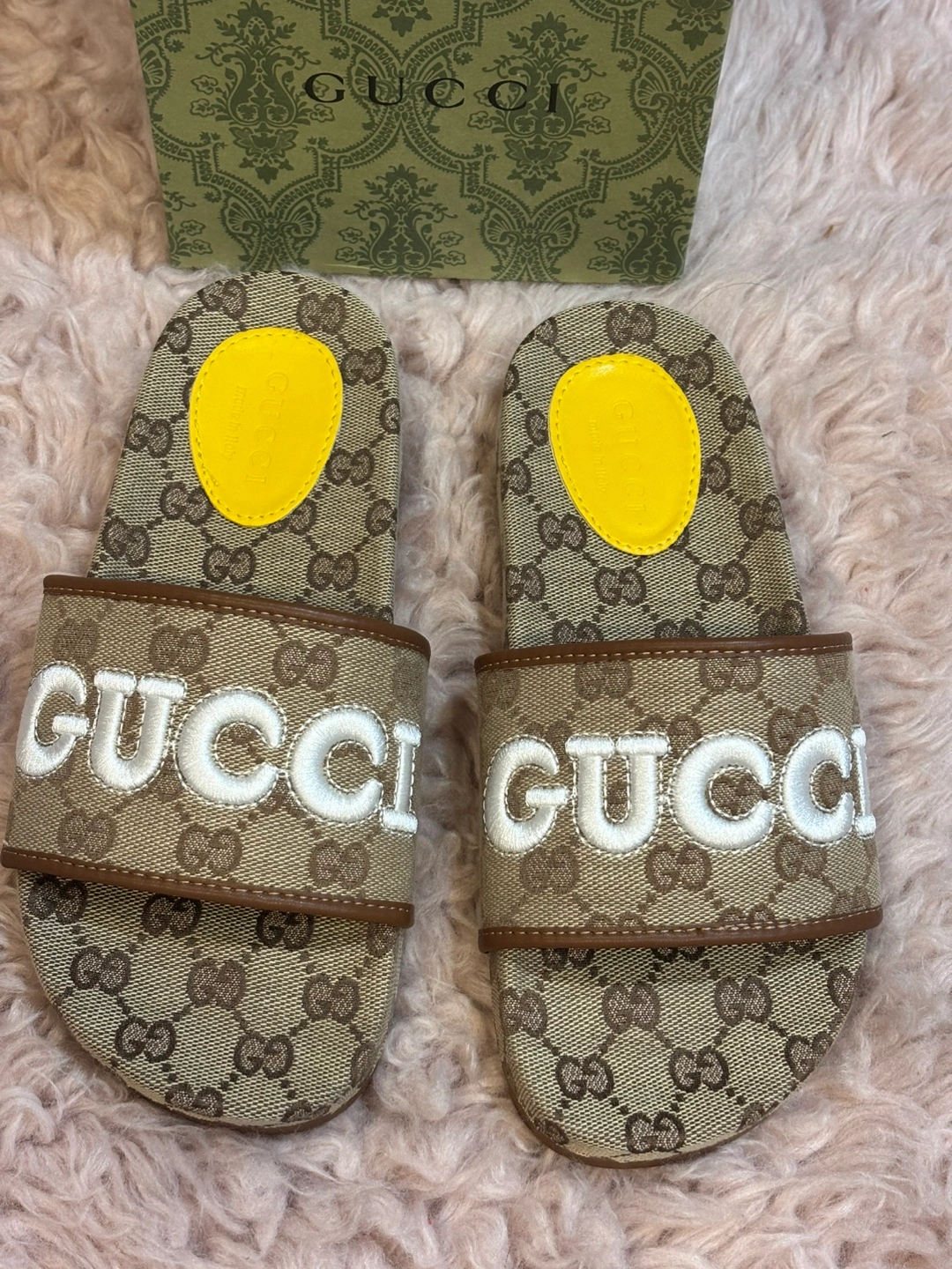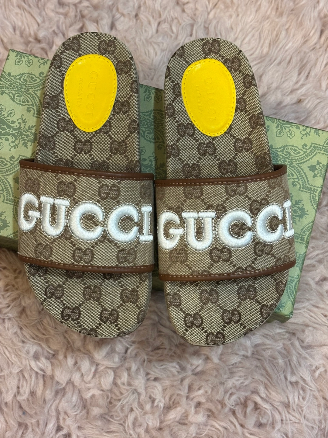 These Gucci slides are in great condition and come with the original box! The size 7 and size 8 (Italian sizing). They feature the classic Gucci logo and pattern. Made in Italy.
