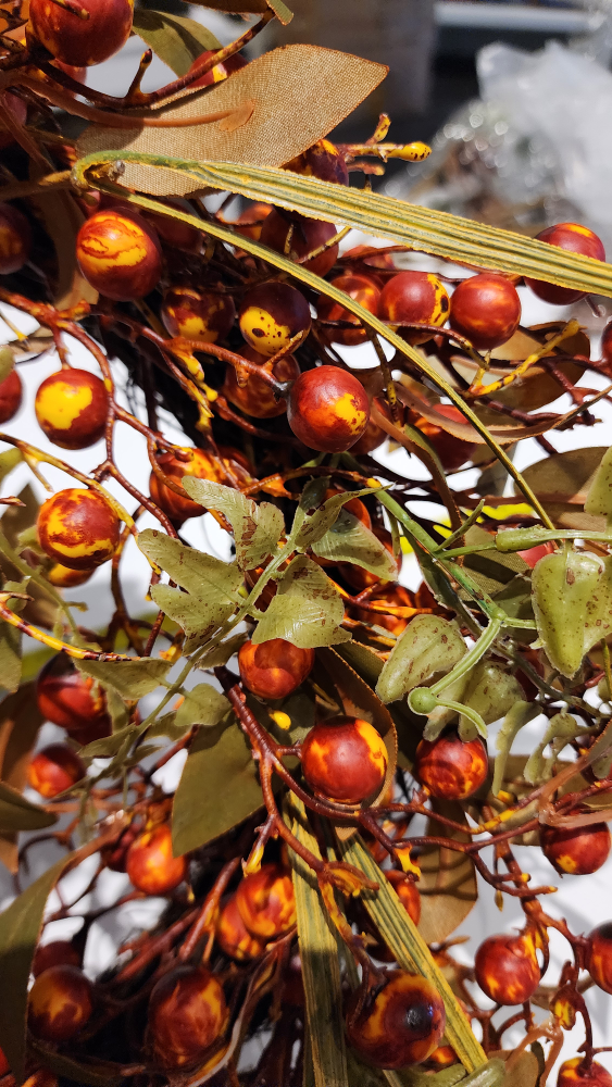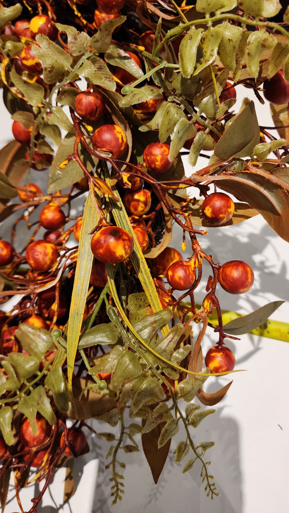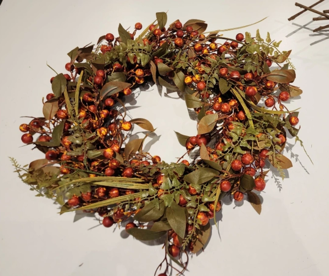 Full fall wreath featuring vibrant berries, mixed foliage and natural twig base. Lush and warm in colour, perfect for front doors, mantels or walls to welcome the season. Used half season in-store for display, excellent condition!