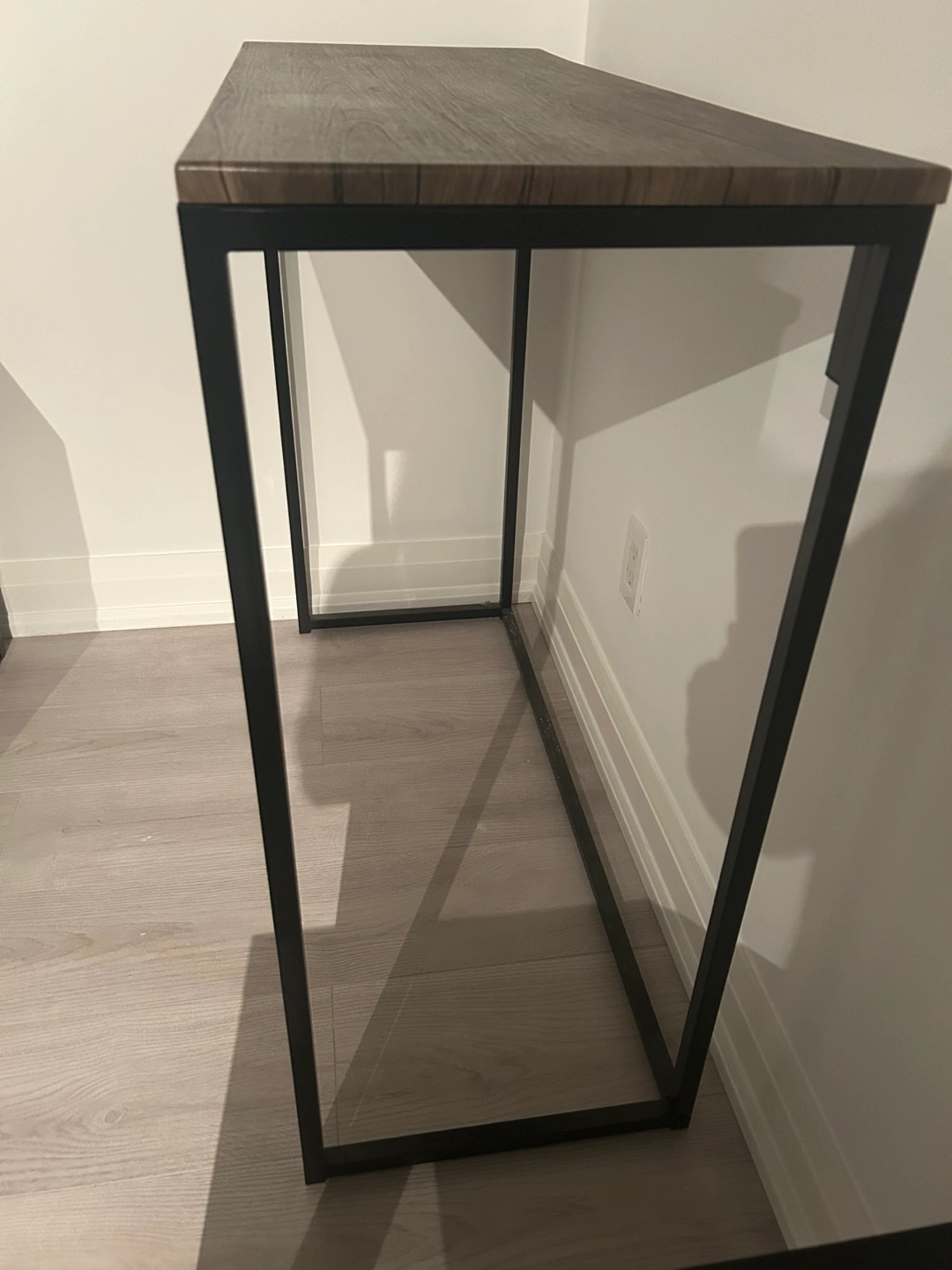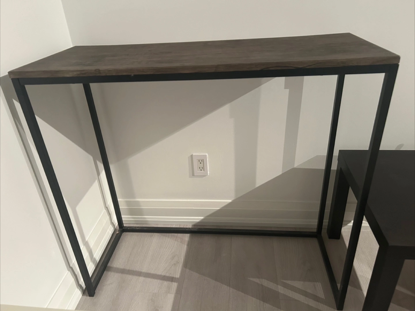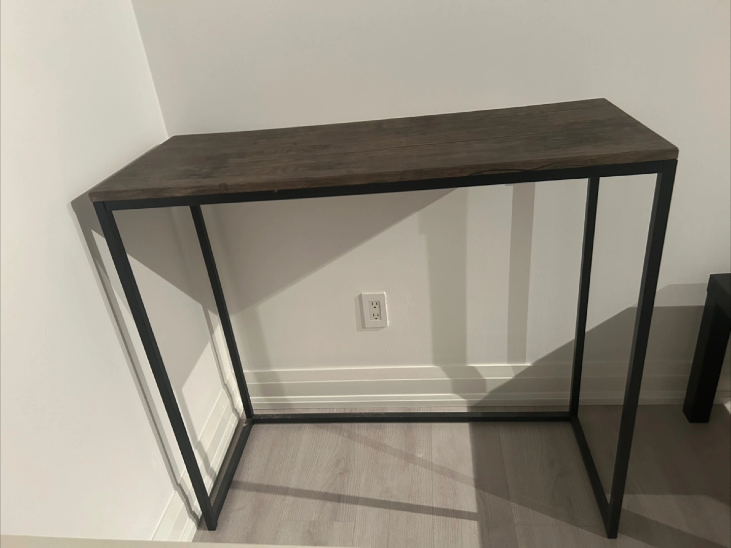 Selling a console table by Wrought Studio! It's a Kahler 39.3" console table with a distressed pecan table top and black metal frame. Originally bought for $206.99!