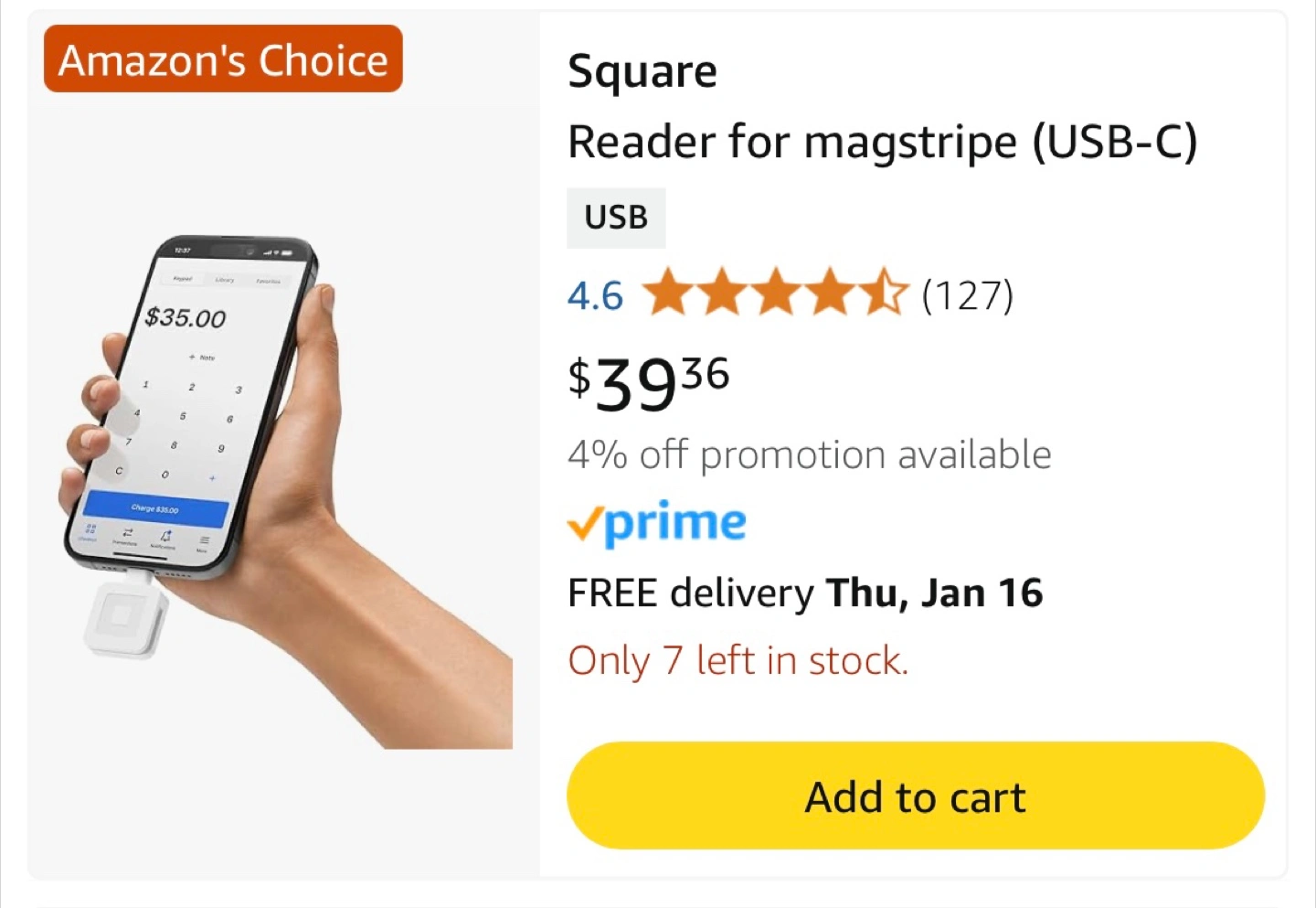 Selling a Square Reader for magstripe cards! It connects to your device through the headset jack. I do have an extra headphone jack adapter for I phone that I will sell for additional $5. Perfect for taking payments on the go. Comes with the original instructions and Square sticker. Amazon picture for reference of regular price.
