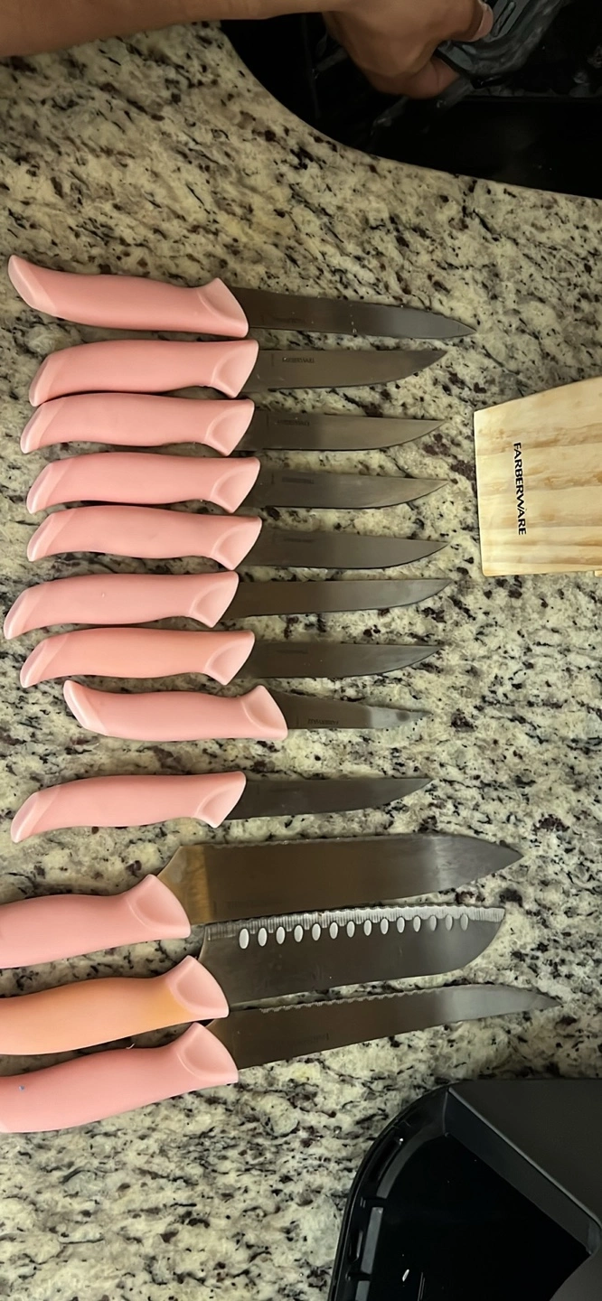 Selling a set of Farberware knives with pink handles. This set includes a variety of knives for different kitchen tasks. Perfect for someone looking to add a pop of color to their kitchen!