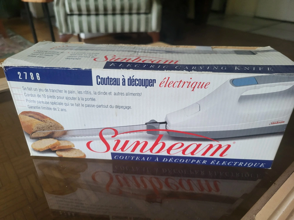 Selling a Sunbeam Electric Carving Knife. This knife is perfect for carving bread, roasts, turkey, and more. The blade is 7 3/4" long.