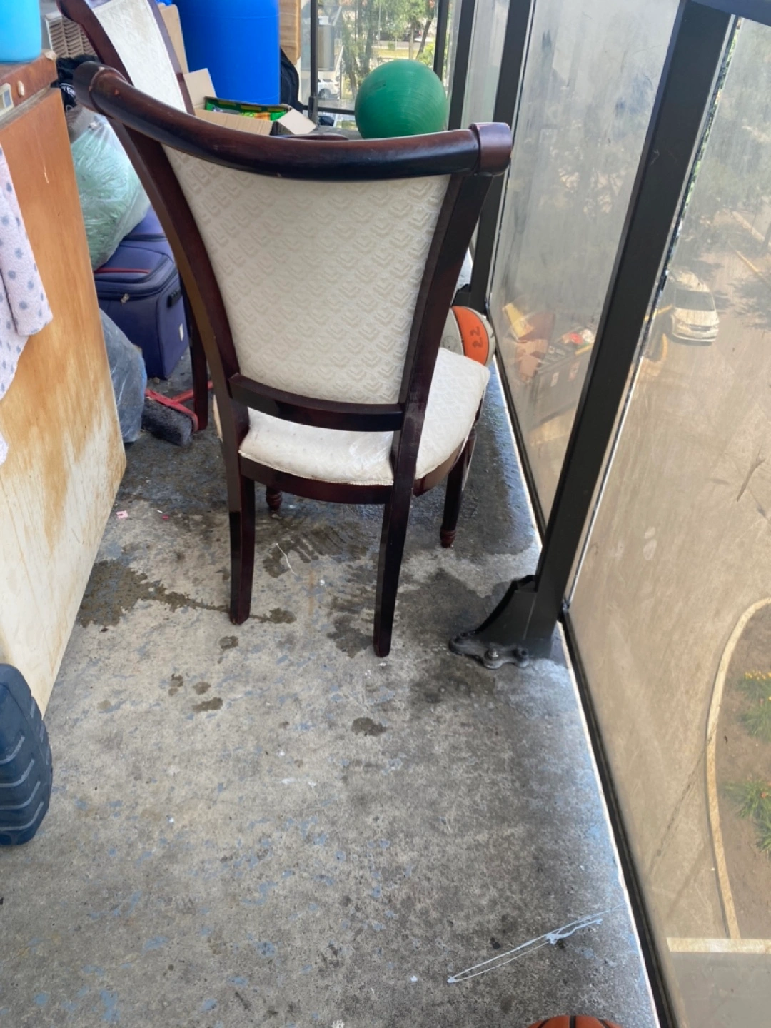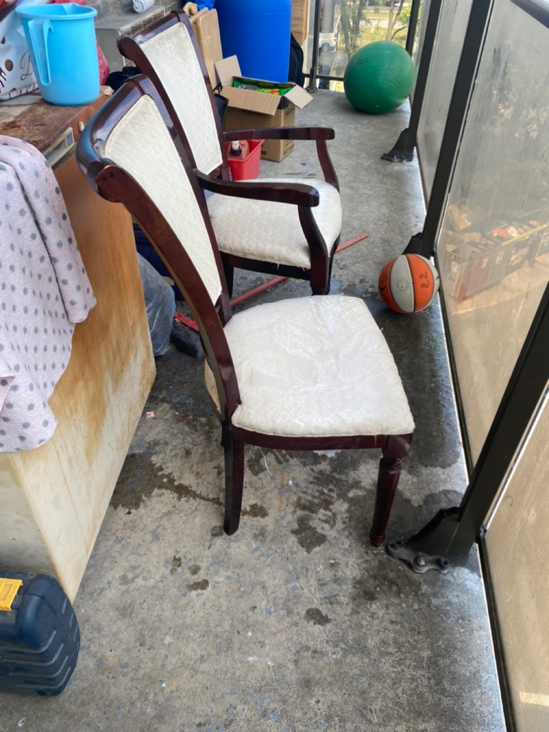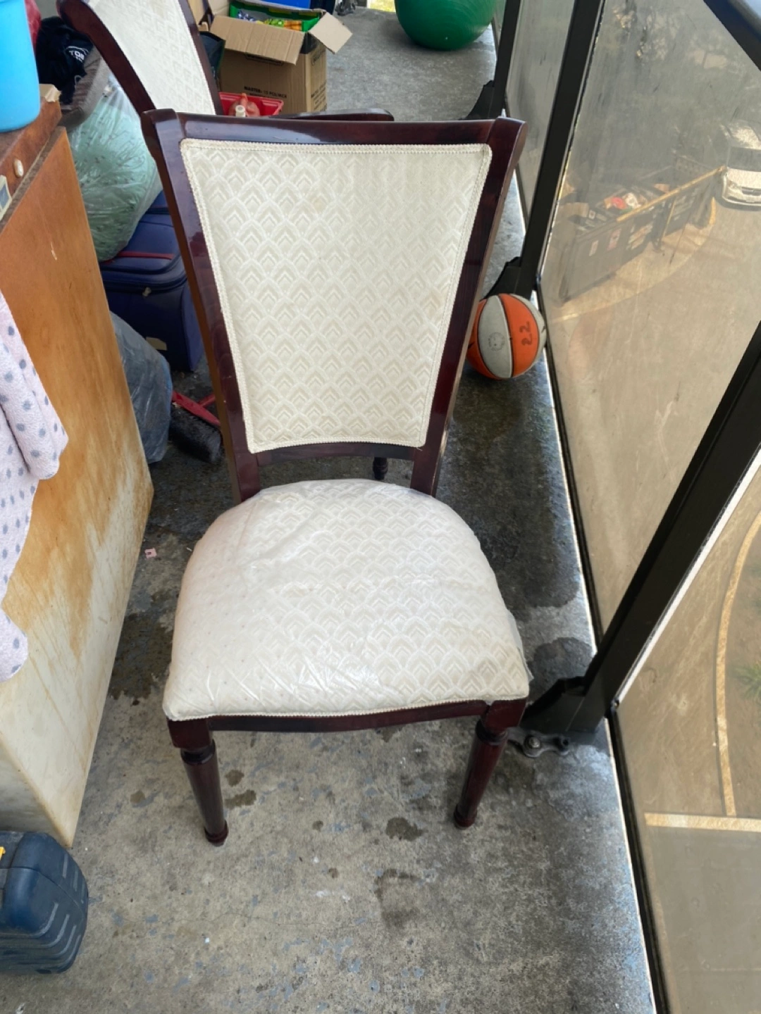 Selling a set of two elegant dining chairs. They feature a dark wood frame and cream-coloured patterned upholstery. Perfect for adding a touch of class to your dining area!