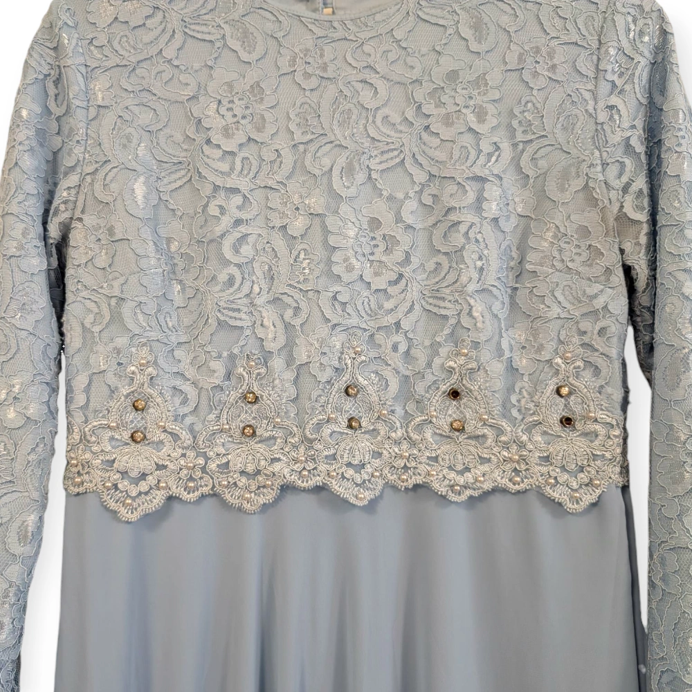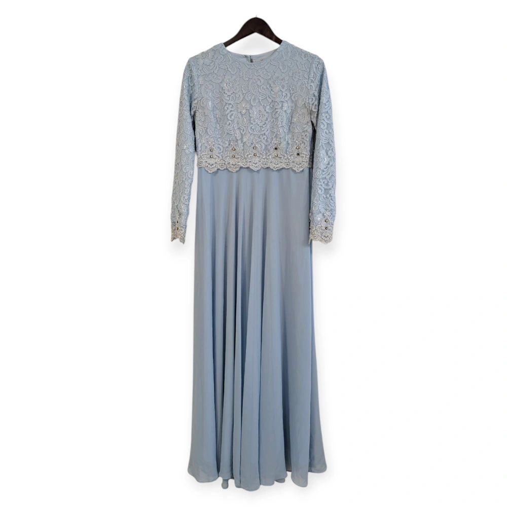 This is a beautiful, light blue maxi dress with long sleeves. It features delicate lace detailing on the bodice and sleeves, adorned with subtle pearl and gem accents. The dress flows gracefully to the floor, making it perfect for a special occasion.