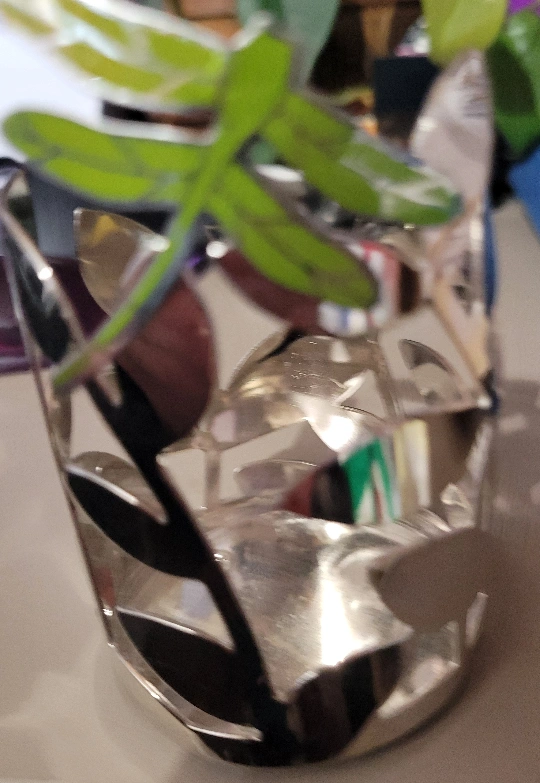 This is a Bath & Body Works candle holder with a silver finish and a leaf design and green dragonfly. It's in great condition and would look lovely in any room of your home.