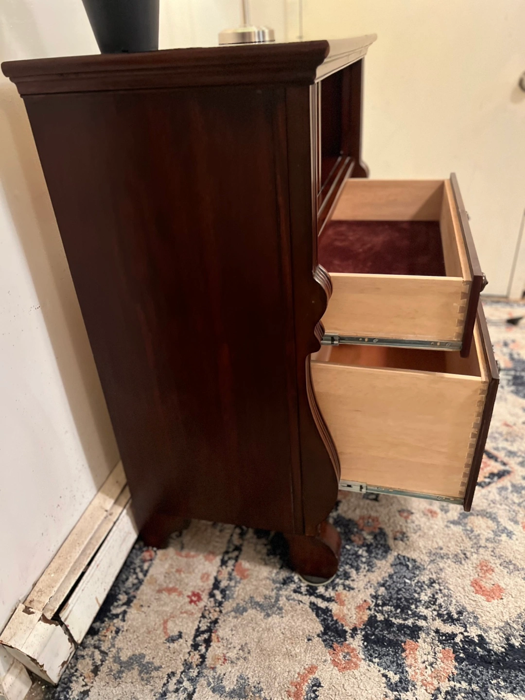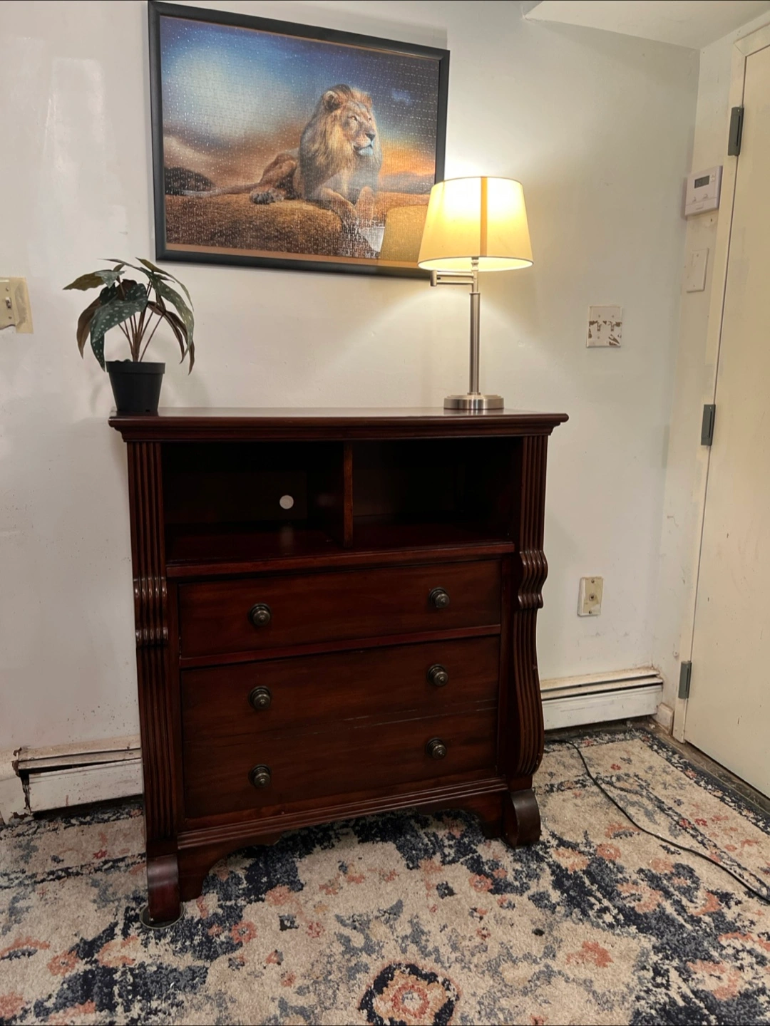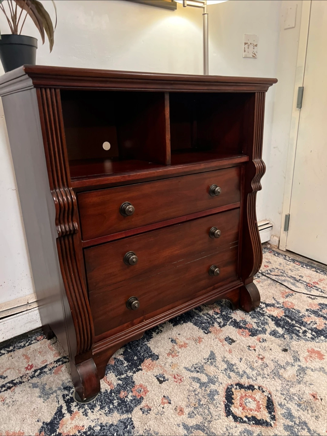 415Selling a small dresser with two drawers and top is designed for a TV stand where you have slots right underneath to keep entertainment items. Bottom drawer is very deep. Drawers open and close smoothly. Sturdy and functional but has some cosmetic imperfection/wear from normal usage. Measurement - 18.25” x 47” x 40.5” (DxWxH) Cash, Venmo, Zelle, or CashApp can be used for payment