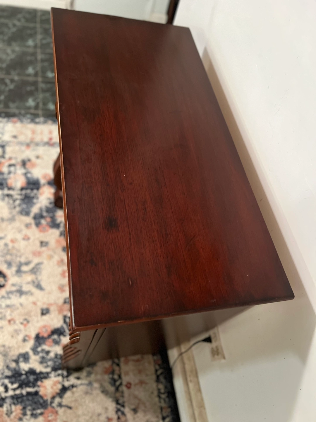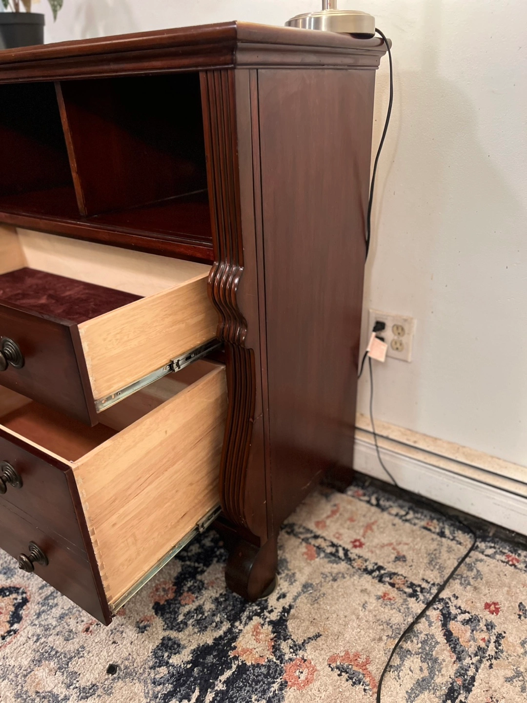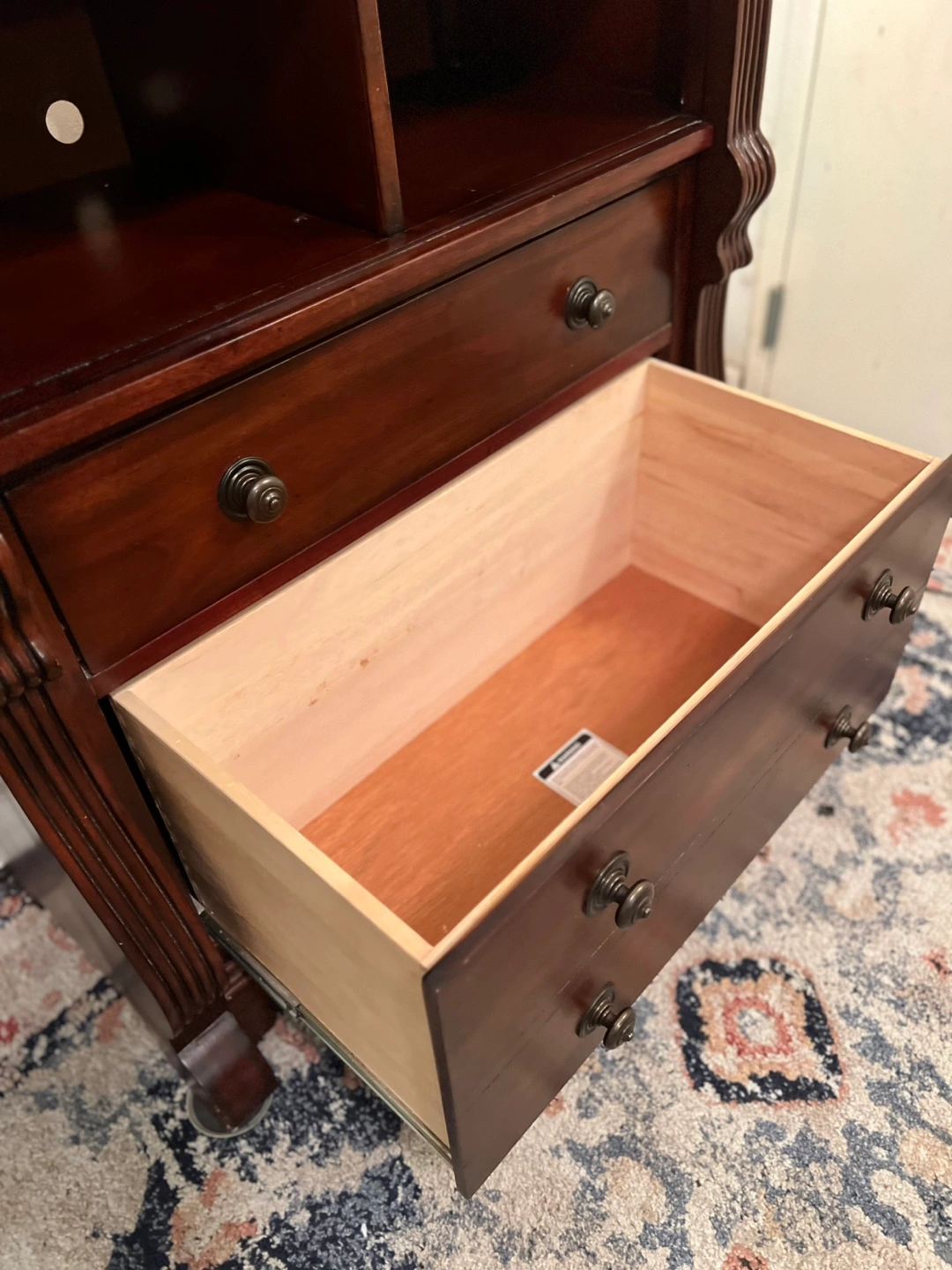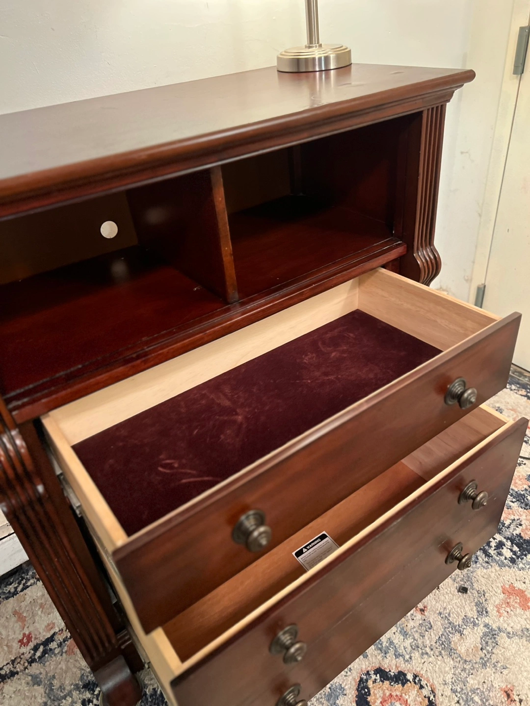 415Selling a small dresser with two drawers and top is designed for a TV stand where you have slots right underneath to keep entertainment items. Bottom drawer is very deep. Drawers open and close smoothly. Sturdy and functional but has some cosmetic imperfection/wear from normal usage. Measurement - 18.25” x 47” x 40.5” (DxWxH) Cash, Venmo, Zelle, or CashApp can be used for payment