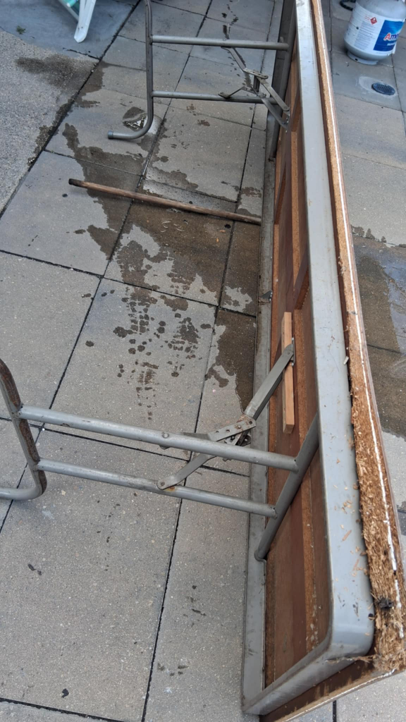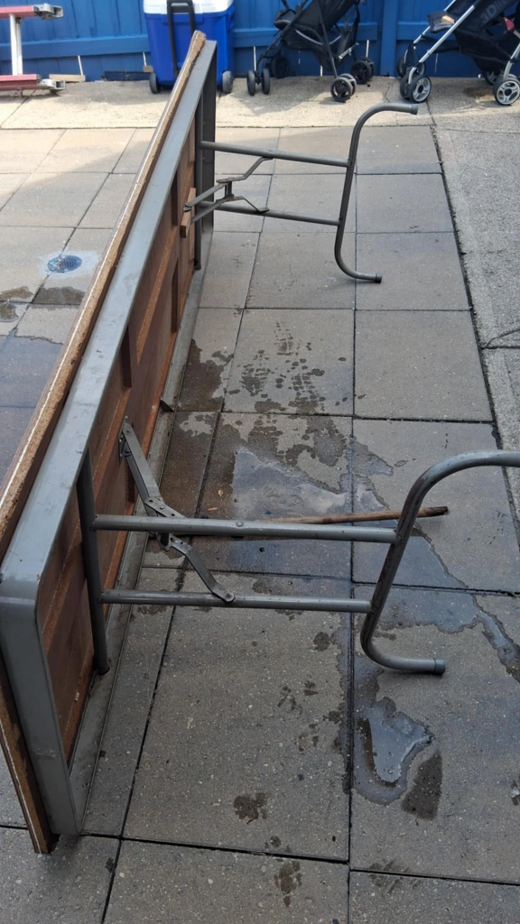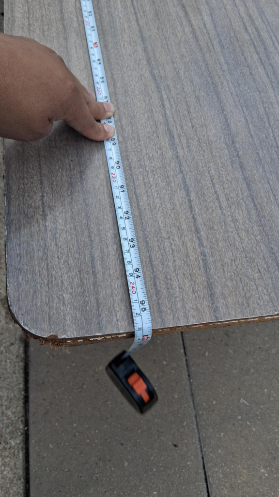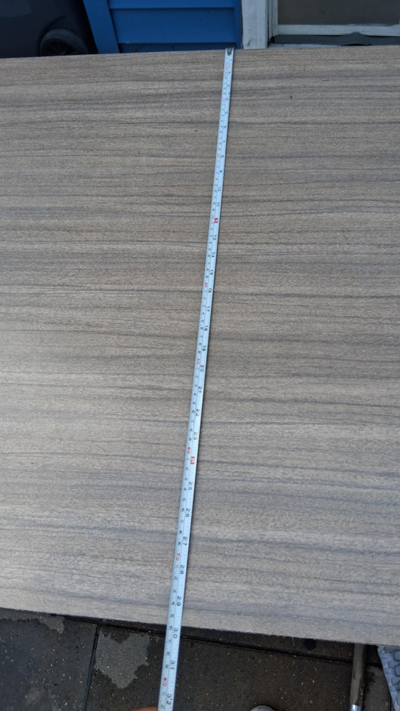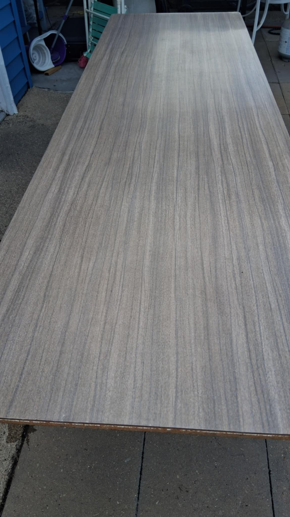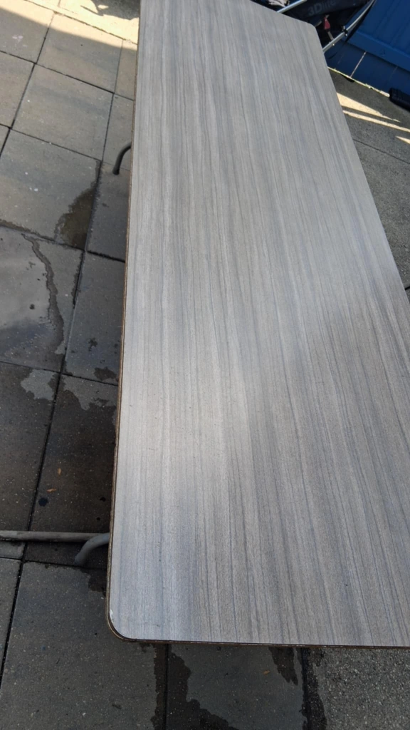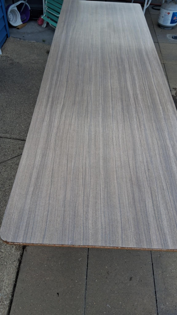 Selling a table with a wood grain finish. It measures approximately 8 ft in length. The table appears to be in good condition and would be great for various uses