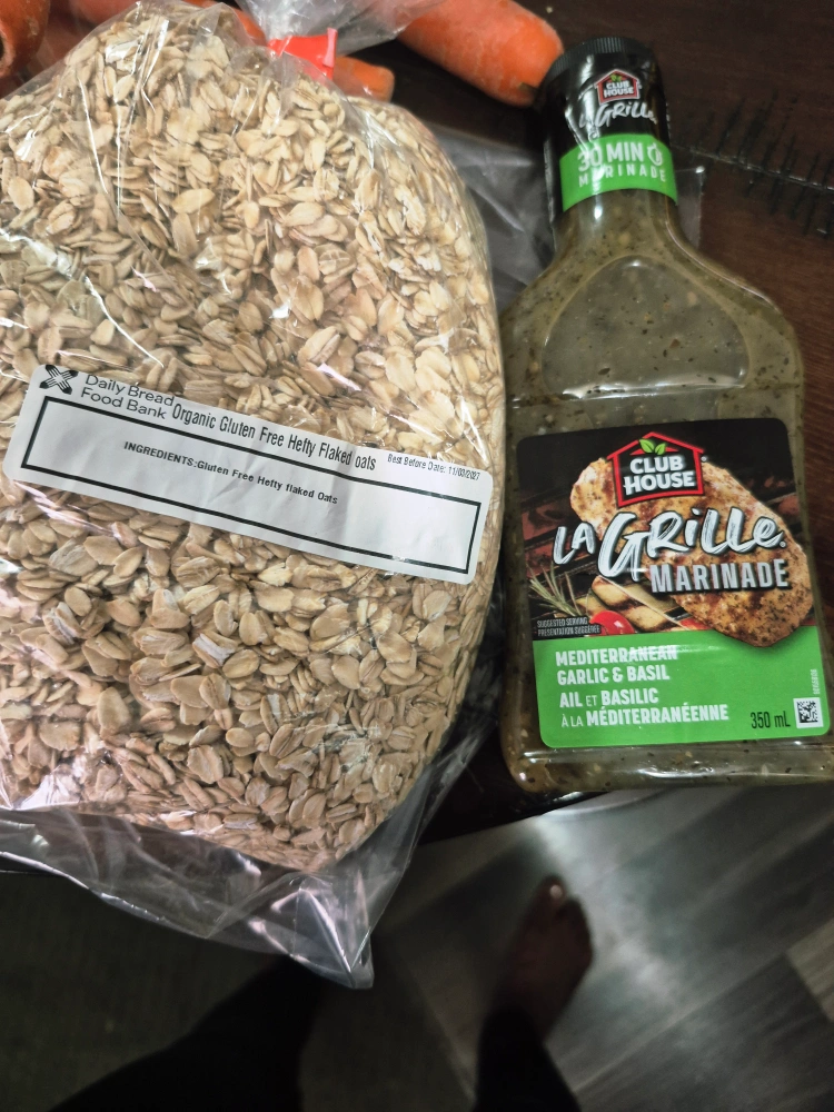 Selling a bag of Daily Bread Organic Gluten Free Hefty Flaked Oats and a bottle of Club House La Grille Mediterranean Garlic & Basil Marinade. The oats have a best before date of November 3, 2027, and the marinade is 350 mL