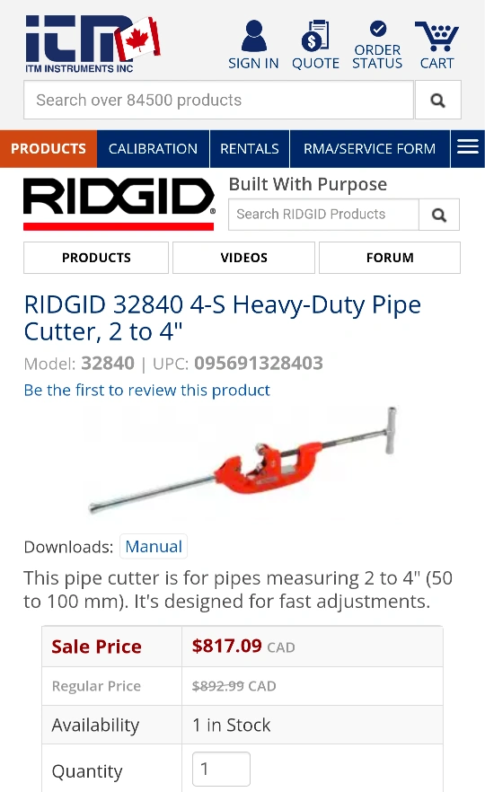Selling a RIDGID No. 4-S Heavy Duty Pipe Cutter. It has a 2" to 4" cutting capacity. This standard wheel cutter is 25 1/2 inches in length. Well-loved in fantastic shape!