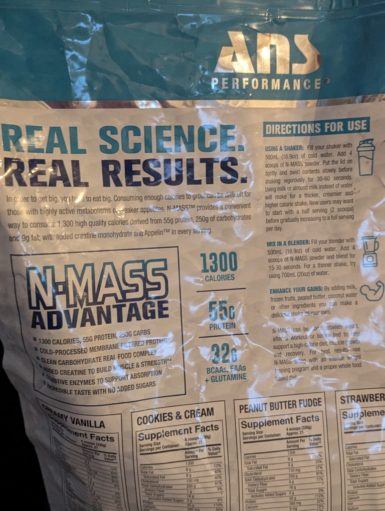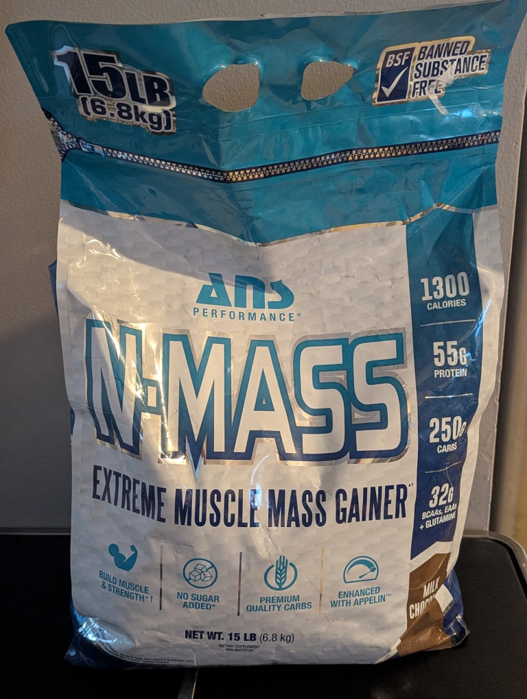 Selling a 15lb bag of ANS Performance N-MASS Extreme Muscle Mass Gainer in milk chocolate flavour! This mass gainer has 1300 calories, 55g protein, and 250g carbs per serving to help you bulk up. It also contains added creatine to build muscle and strength. Perfect for anyone looking to gain weight and muscle mass!