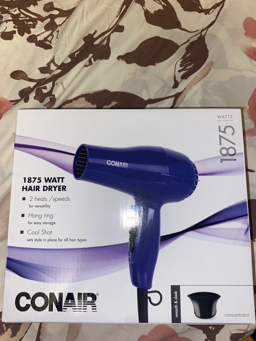 Selling a brand new Conair 1875 Watt Hair Dryer, still in its original packaging! It has 2 heat/speed settings for versatility, a hang ring for easy storage, and a cool shot button to set your style. It also comes with a concentrator attachment for smooth & sleek styles