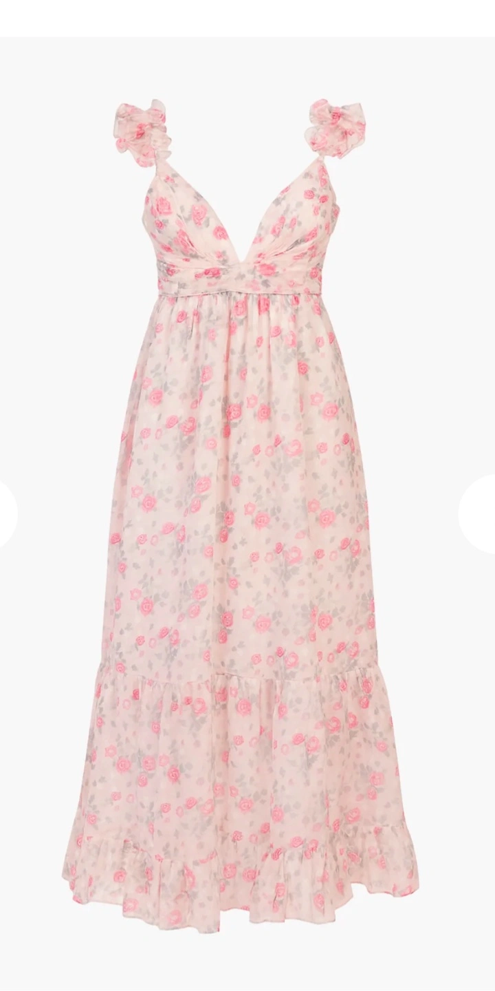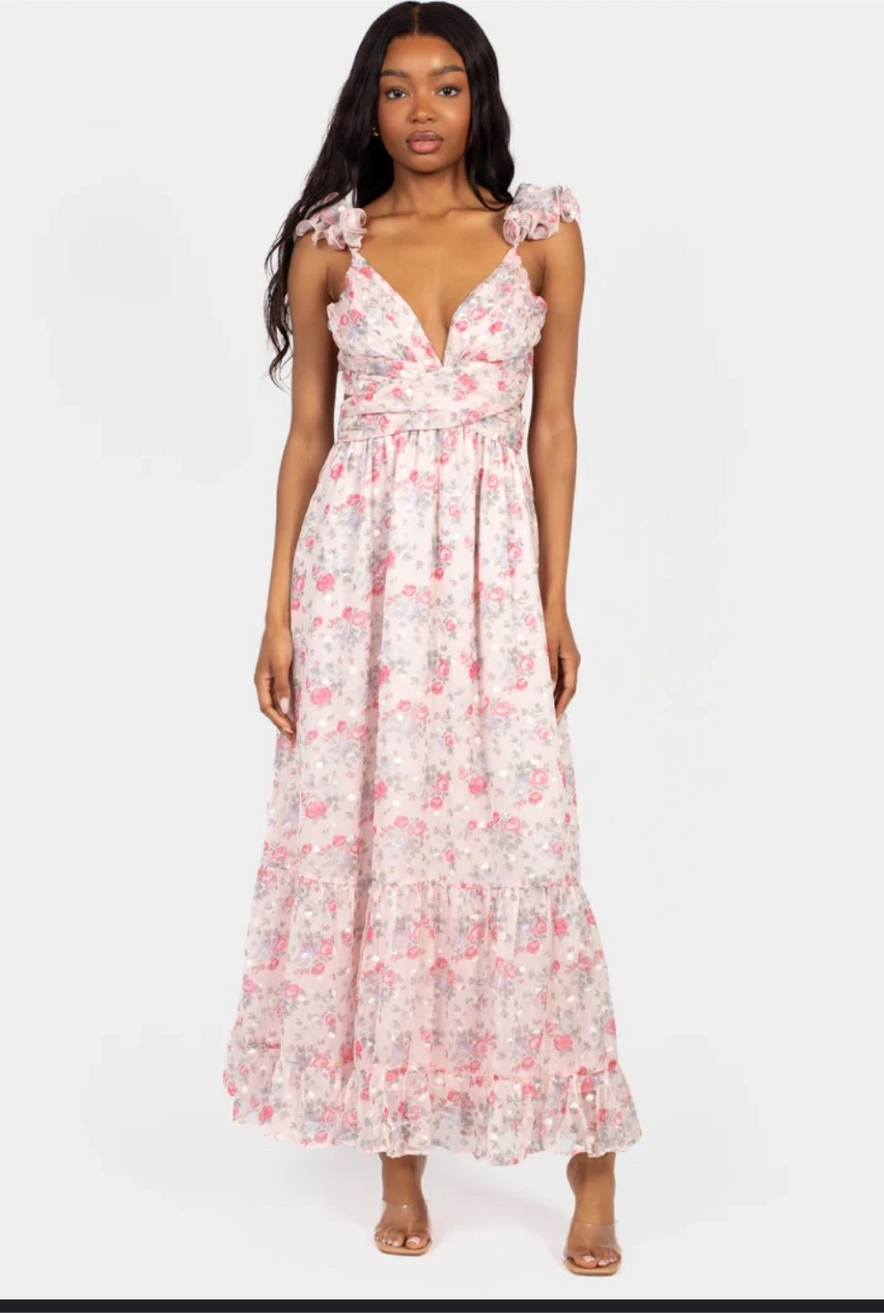 Selling a beautiful Honey & Rosie floral maxi dress! It's a lovely light pink colour with a delicate floral pattern, perfect for a special occasion or a summer day out