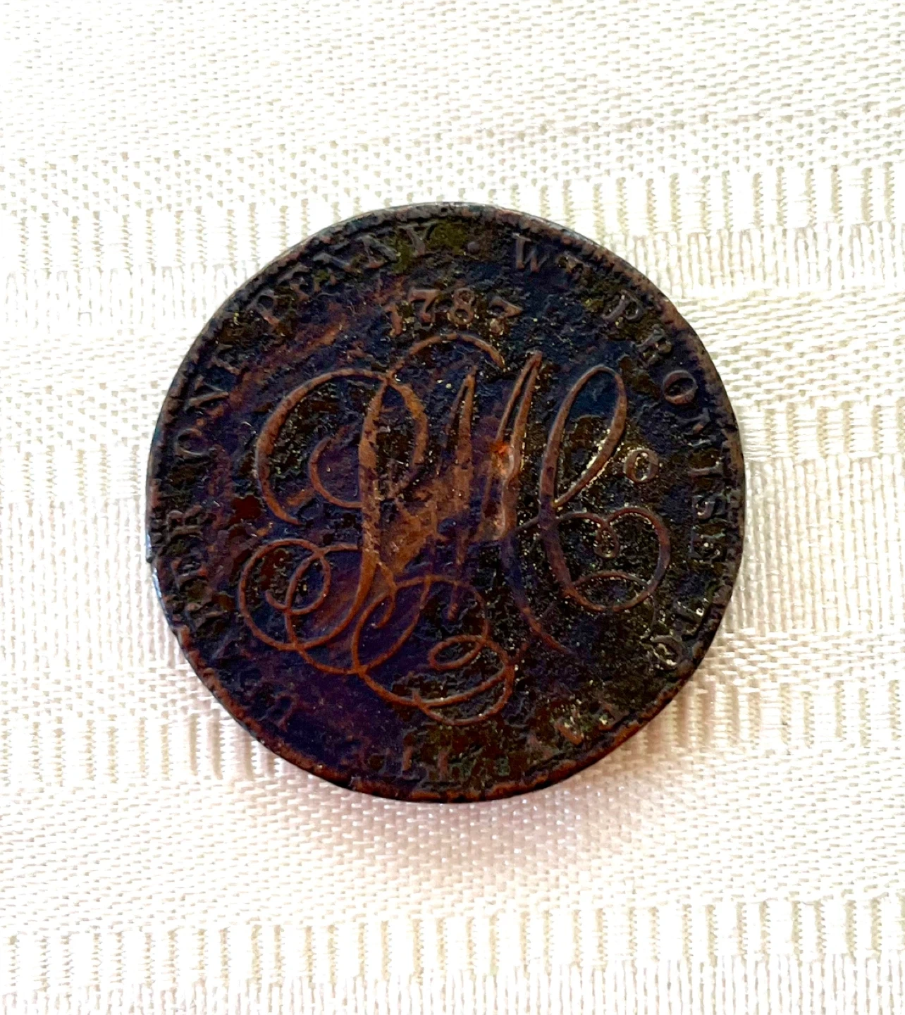 A beautiful Copper Penny Trade Conder Token featuring a druidβs head with a large beard within an oak wreath. On the reverse, PMCo cypher with date 1787 above, around the edge is the engraving WE PROMISE TO PAY THE BEARER ONE PENNY.