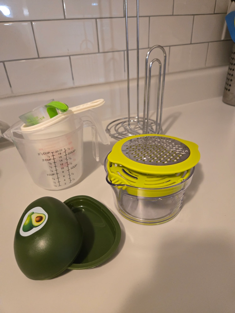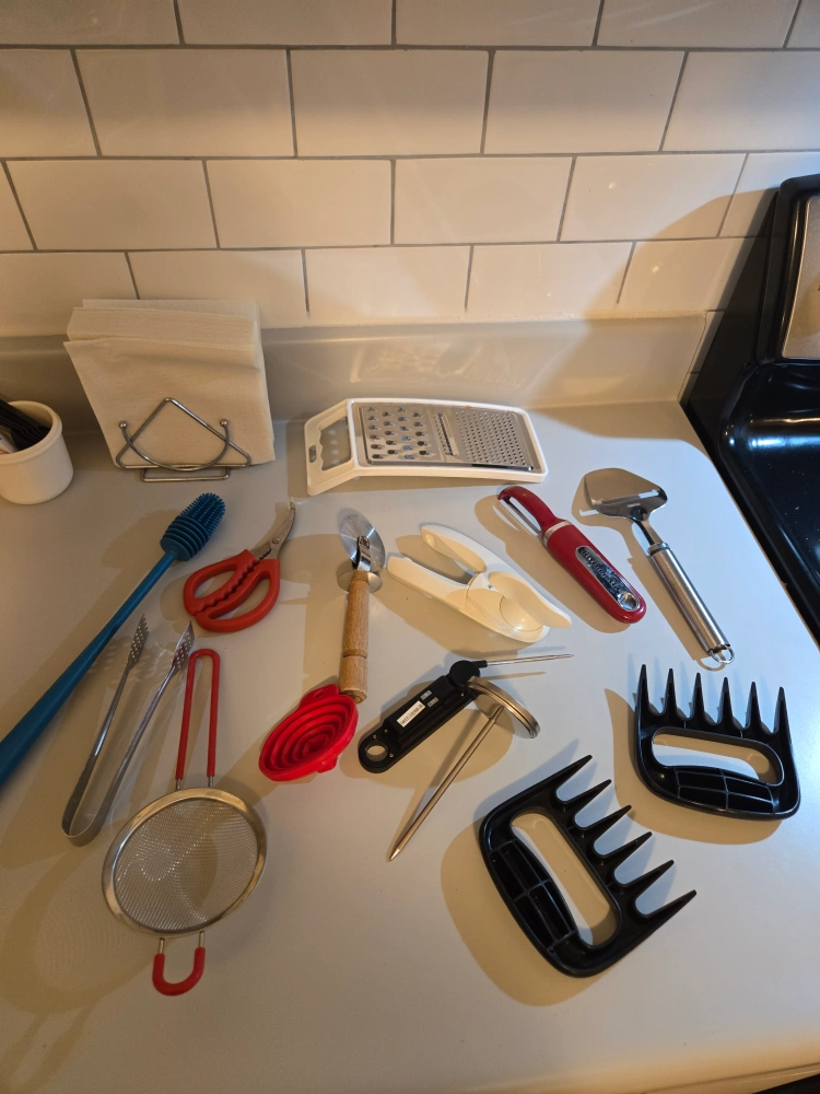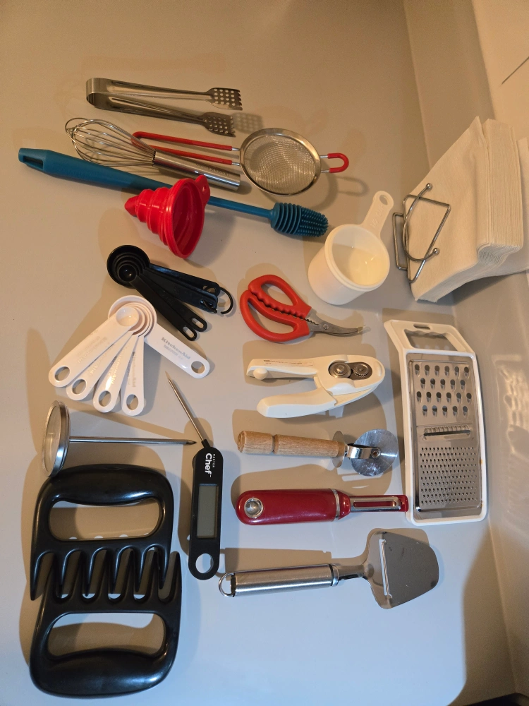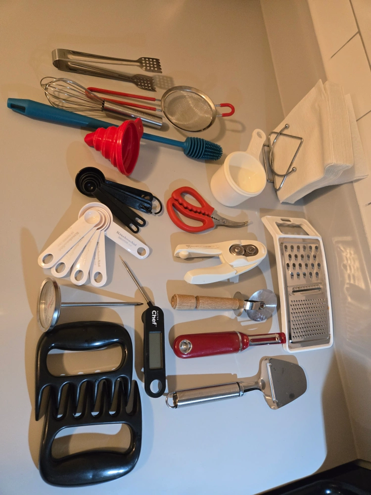 Selling a bundle of kitchen utensils! Includes pitchers, measuring cups and spoons, a meat thermometer, graters, and more. Perfect for equipping a new kitchen or replacing old tools