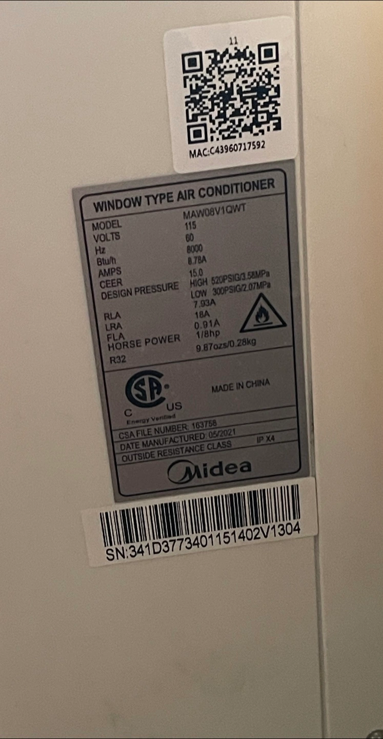 Selling a Midea window type air conditioner, model MAW08V1QWT. It's in great condition and ready to keep you cool! This model features 8000 BTU/h and a CEER of 15.0. It also has a smart home integration feature.