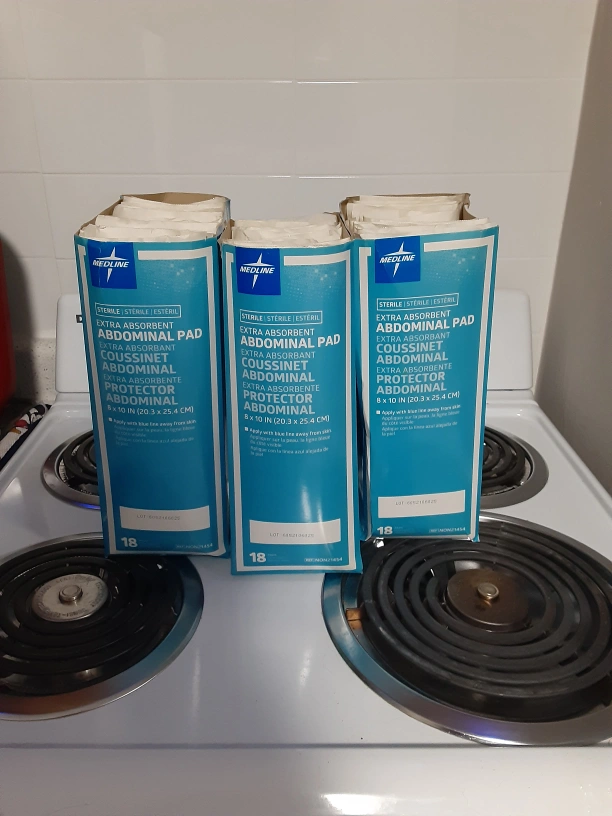 Selling Medline extra absorbent abdominal pads. Each pad is sterile and measures 8 x 10 inches (20.3 x 25.4 cm). Great for wound care!