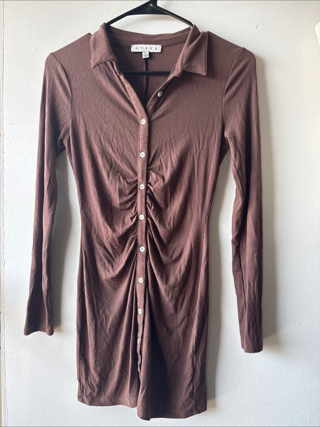 Cute brown ribbed mini dress from HYFVE! It's a size medium and features a button-down front with a collared neckline. Great for a casual day out or dressed up for an evening look
