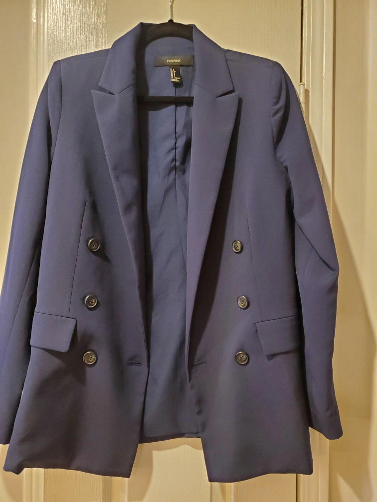 Here's a navy blue blazer from Forever 21! It's a double-breasted style and in great condition. Perfect for adding a touch of sophistication to any outfit