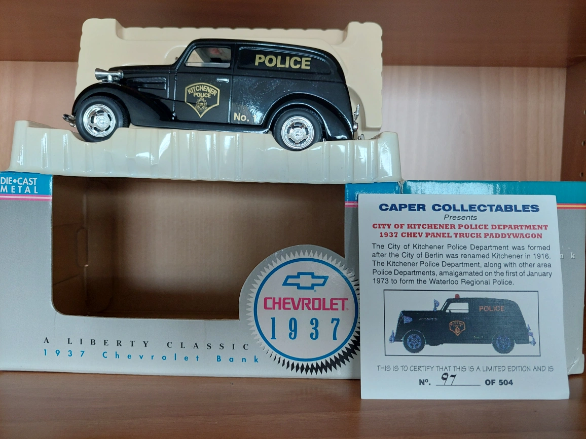 It's a Caper Collectables City of Kitchener Police Department 1937 Chevy Panel Truck Paddywagon. This is a limited edition, number 97 of 504.