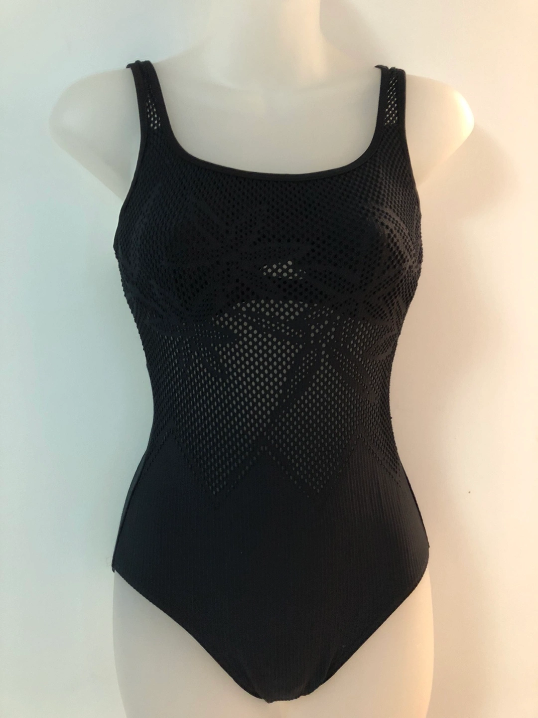 Selling a black swimsuit in size 10. It features a unique mesh design on the front and back. Perfect for swimming or lounging by the pool!