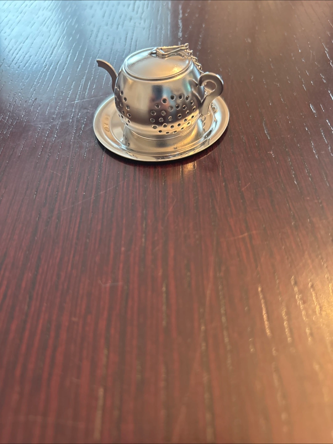 Tea infuser with a drip catcher! It's in great condition and perfect for brewing loose leaf tea. It’s in the shape of a teapot. Enjoy a cuppa with this handy gadget