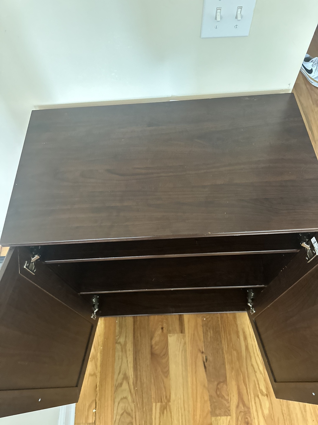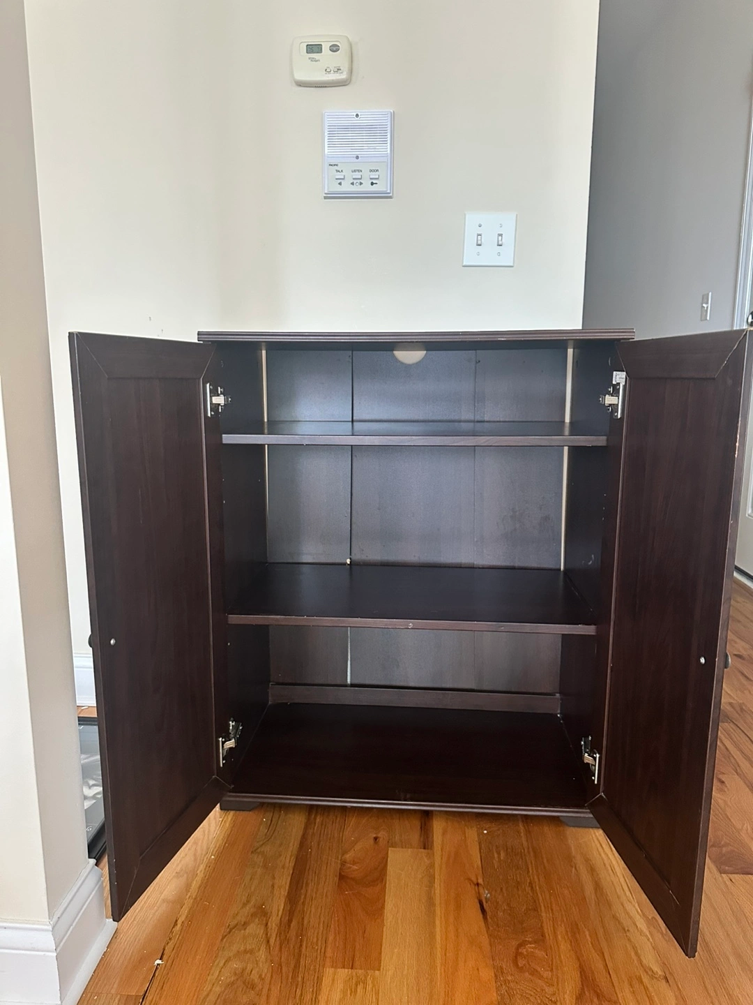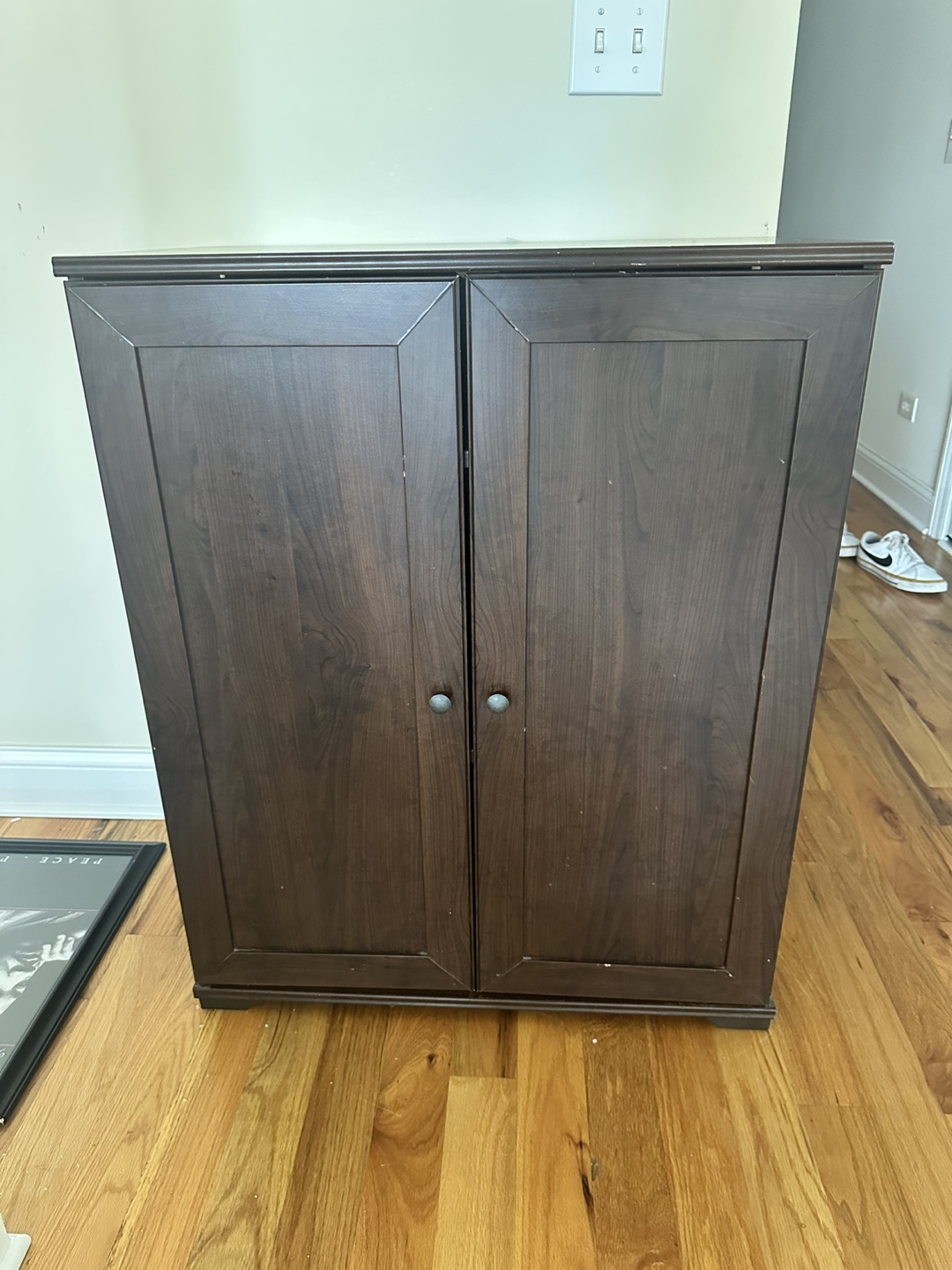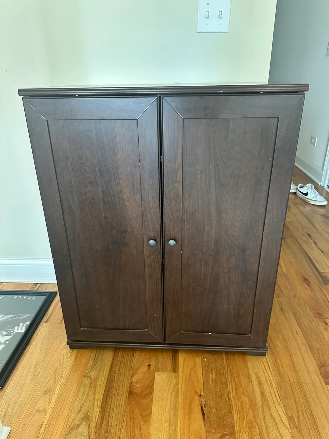 I'm selling a dark brown wooden cabinet. It features a double-door design and multiple shelves for storage. It's perfect for organizing your space!