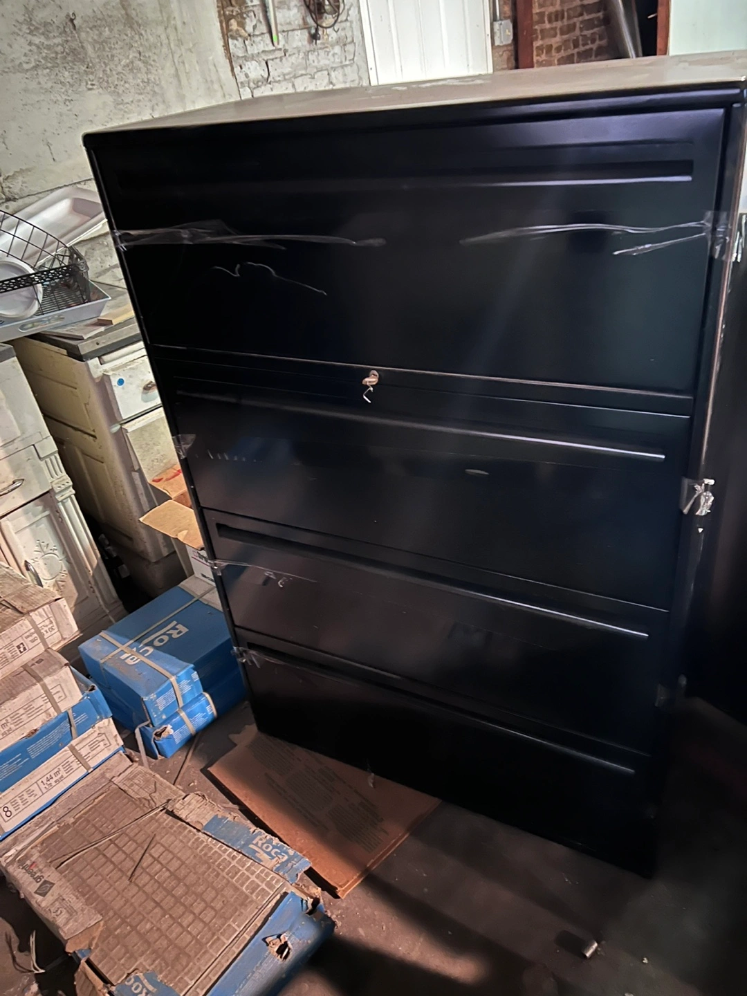 Selling a black metal filing cabinet with four drawers. It's perfect for organizing your documents and keeping your office tidy. It has a lock and key for security.