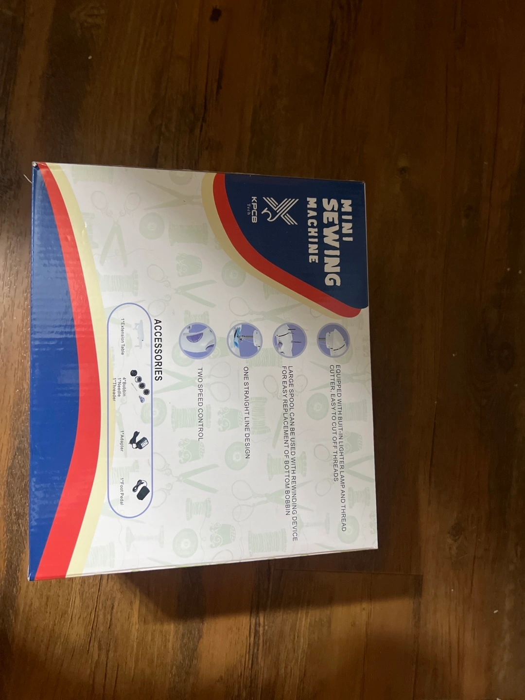 It features two-speed control and a one-straight-line design. The box includes accessories like bobbins, needles, and a threader. It also has a built-in lighter lamp, extension table and thread cutter