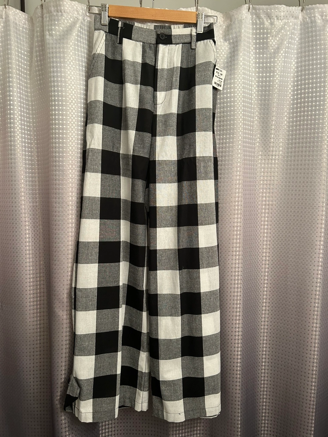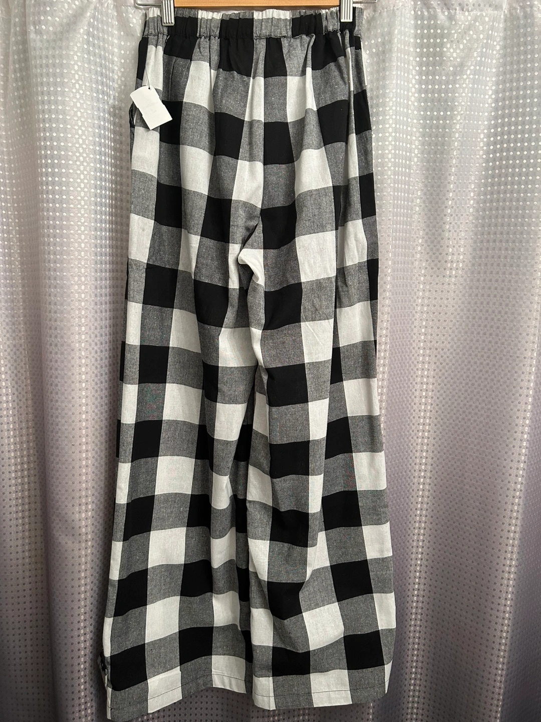 New M Akira black/white checked cotton wide-leg or gathered pants. Run tall. Light fabric makes these suitable for summer evenings. Can wear wide-legged or gathered at the ankle. Unique and comfortable.