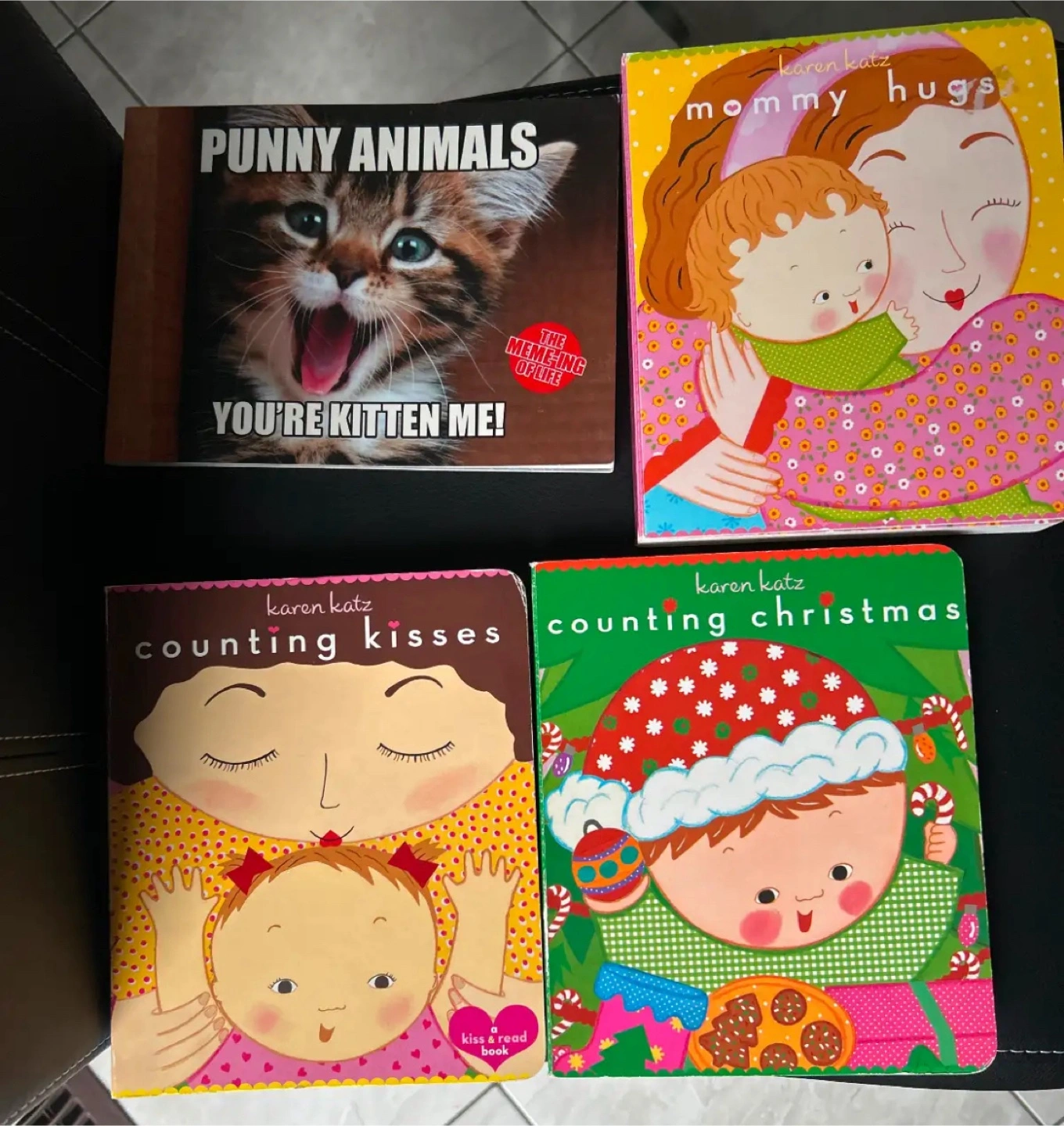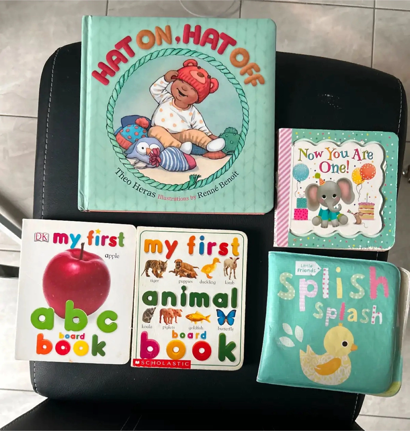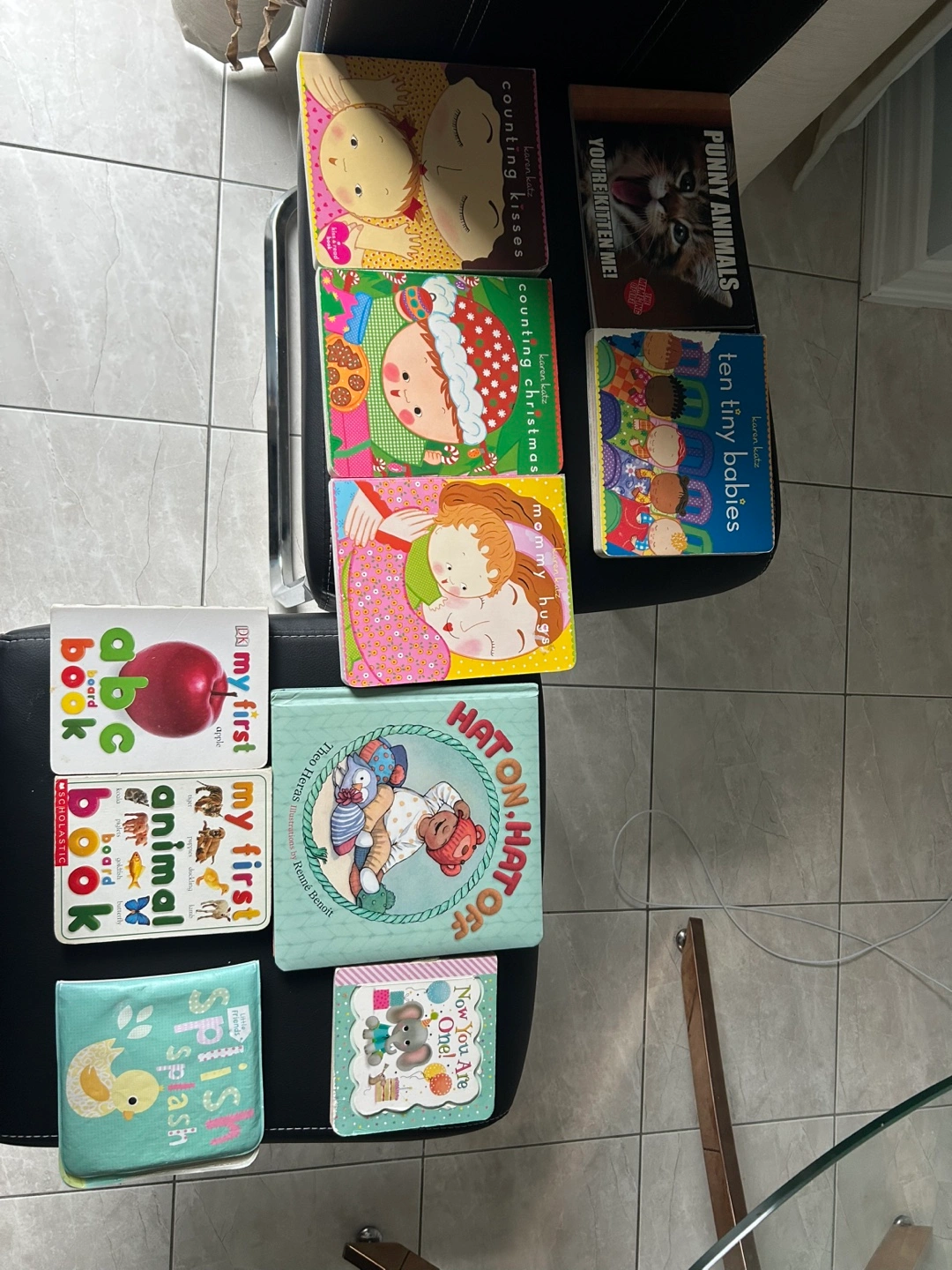 Selling a bundle of kids' board books! 10 books for $10. Most books are in very good condition a couple of some wear marks. Includes titles like 'Counting Kisses,' 'Counting Christmas,' 'Mommy Hugs,' 'Ten Tiny Babies,' 'Punny Animals,' 'My First Animal Book,' 'ABC Book,' 'Hat On, Hat Off' by Theo Heras, “Now You Are One!”, 'Splish Splash' from Little Friends,