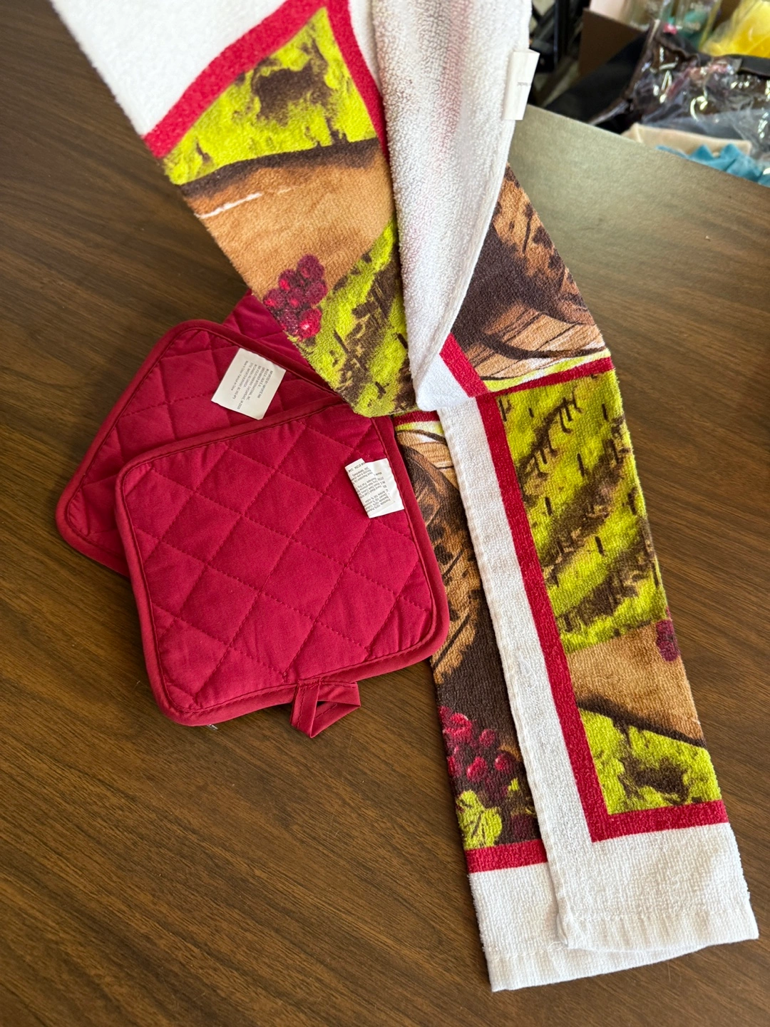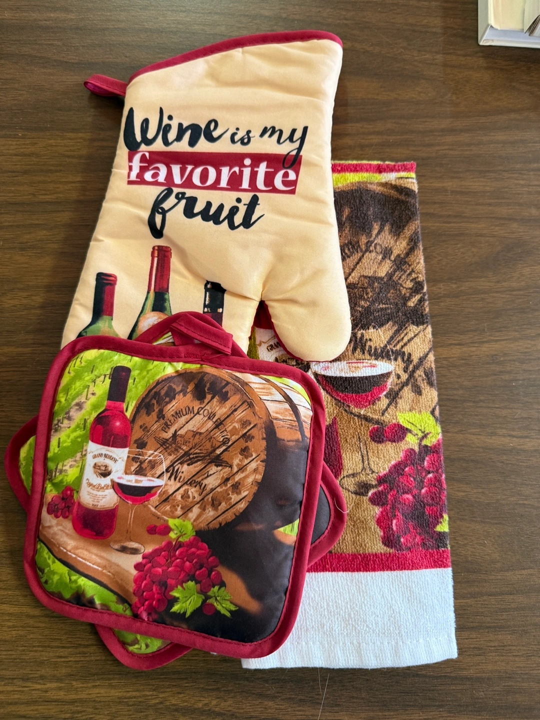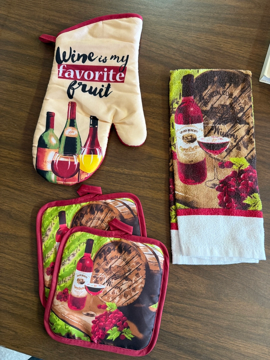 I'm selling a cute wine-themed kitchen set! It includes an oven mitt, two pot holders, and a kitchen towel. Perfect for adding a touch of fun to your kitchen decor.