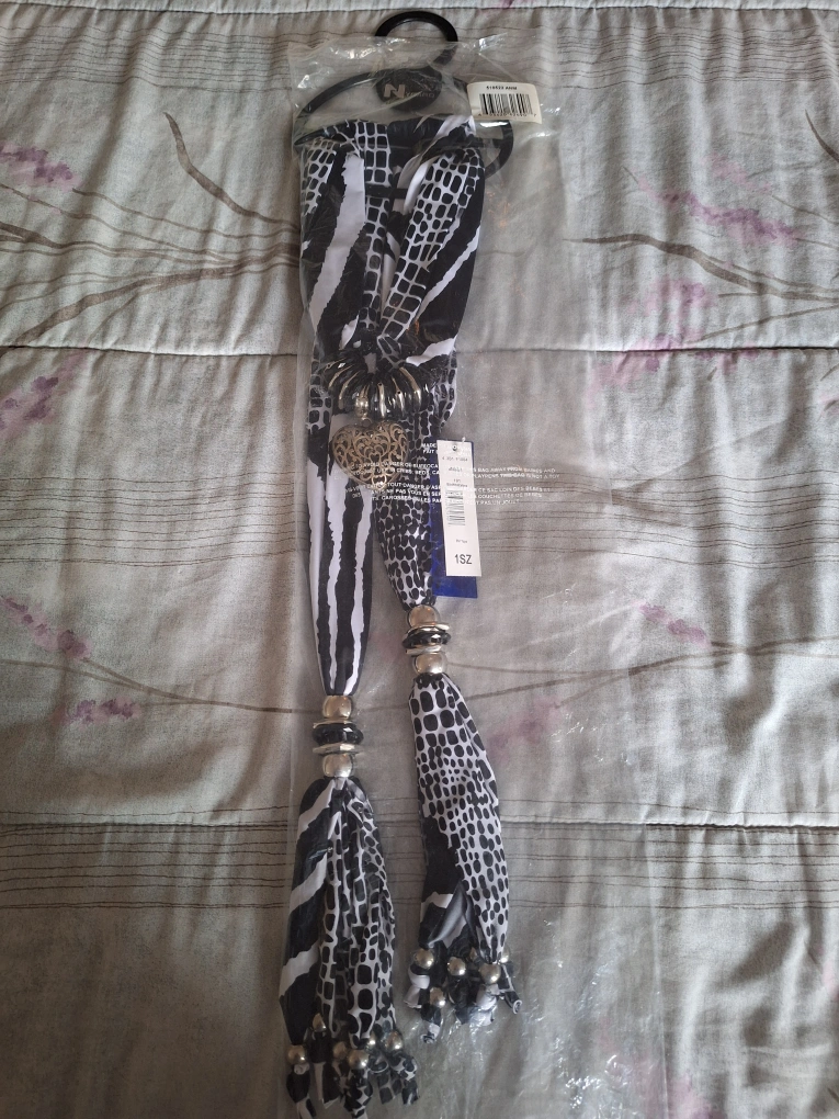 Here's a stylish scarf from N Nygard! It features a fun zebra and dalmatian print in black and white. The scarf also has decorative silver-tone beads and a heart-shaped ornament. It's still in its original packaging!