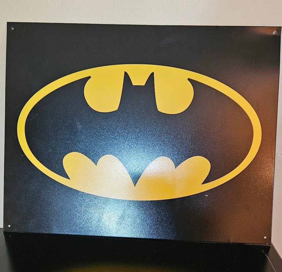 Batman logo wall art piece! It features the classic Batman emblem in yellow against a black background. Perfect for adding a touch of superhero flair to any room