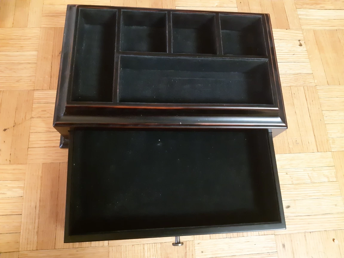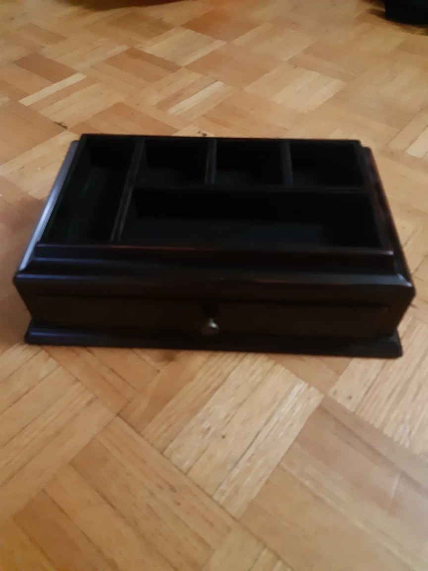 Selling a lovely wooden jewelry box! It features several compartments on top for organizing your rings, earrings, and other small items, plus a drawer for extra storage. It's in great condition and ready to keep your treasures safe and organized