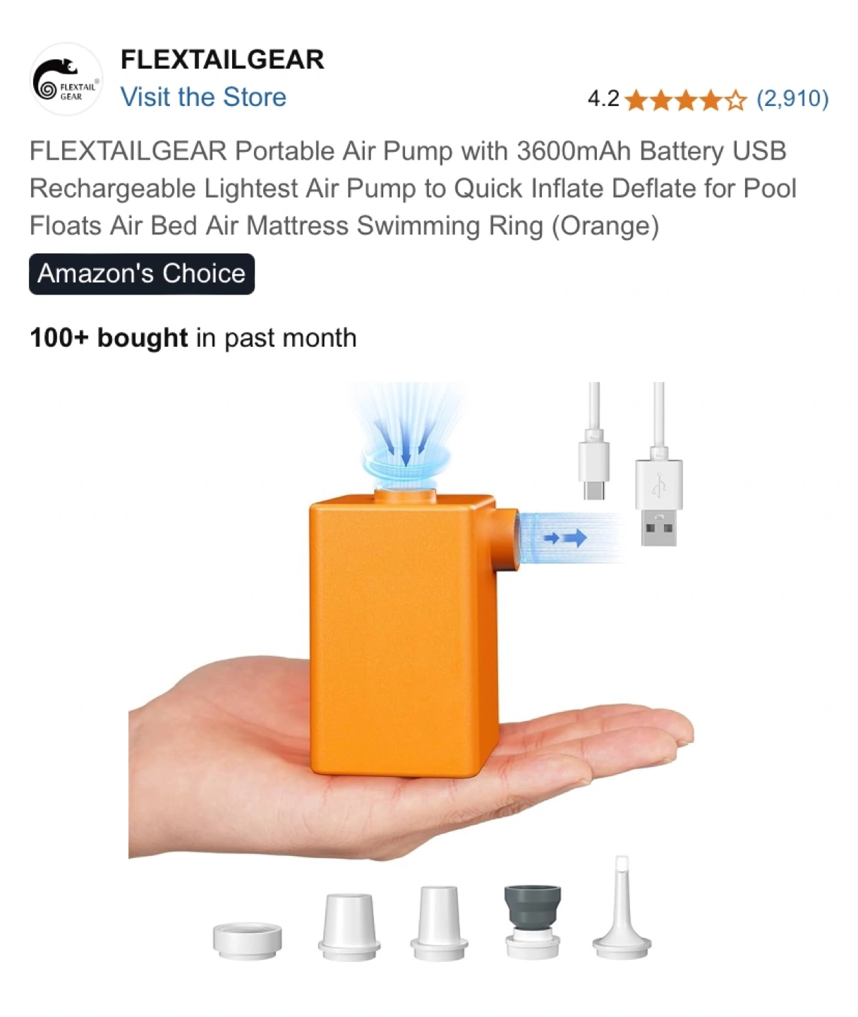 Selling a FLEXTAILGEAR portable air pump. It's USB rechargeable and has a 3600mAh battery.