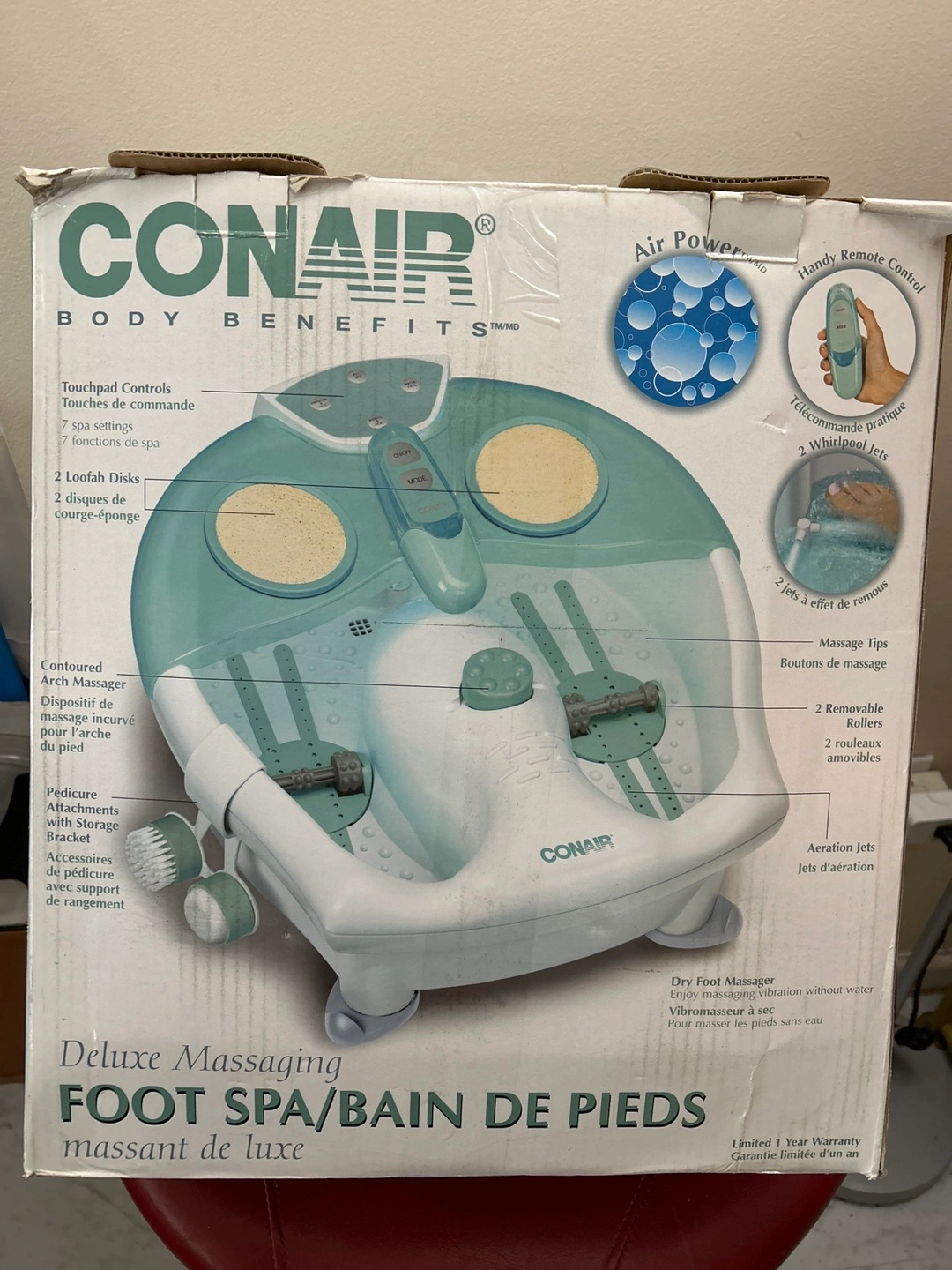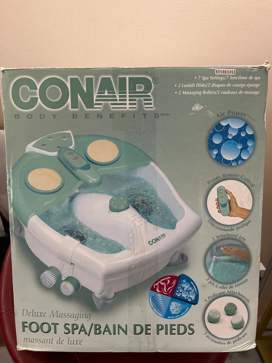 Selling a Conair Body Benefits Deluxe Massaging Foot Spa. It comes with 7 spa settings, 2 loofah disks, and 2 massaging rollers. Also includes handy remote control, 2 whirlpool jets, and 3 pedicure attachments. Box included!