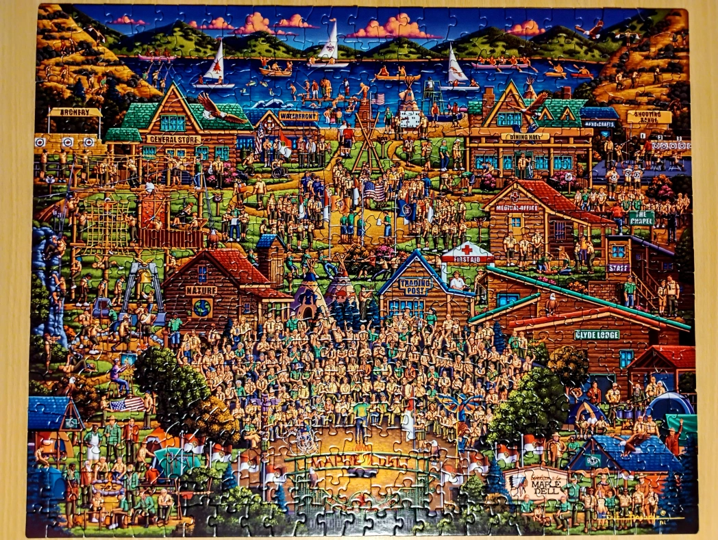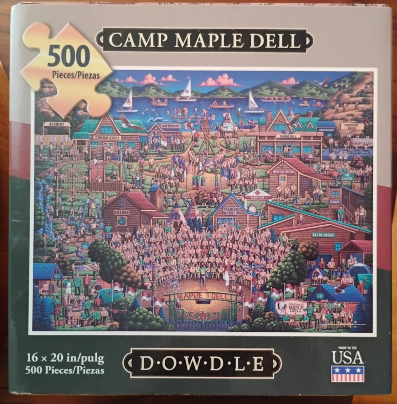 Complete 500 piece puzzle from Dowdle, featuring colourful and intricate artwork by Eric Dowdle. Hundreds of smiling Scout campers are featured enjoying a variety of the activities available at Camp Maple Dell in Utah. comes packaged in a sturdy chest-style box with Velcro closure, a resealable safety bag for pieces, and a legend indicating the 171 portraits of famed Camp alumni amongst the 200+ figures featured in the scene.