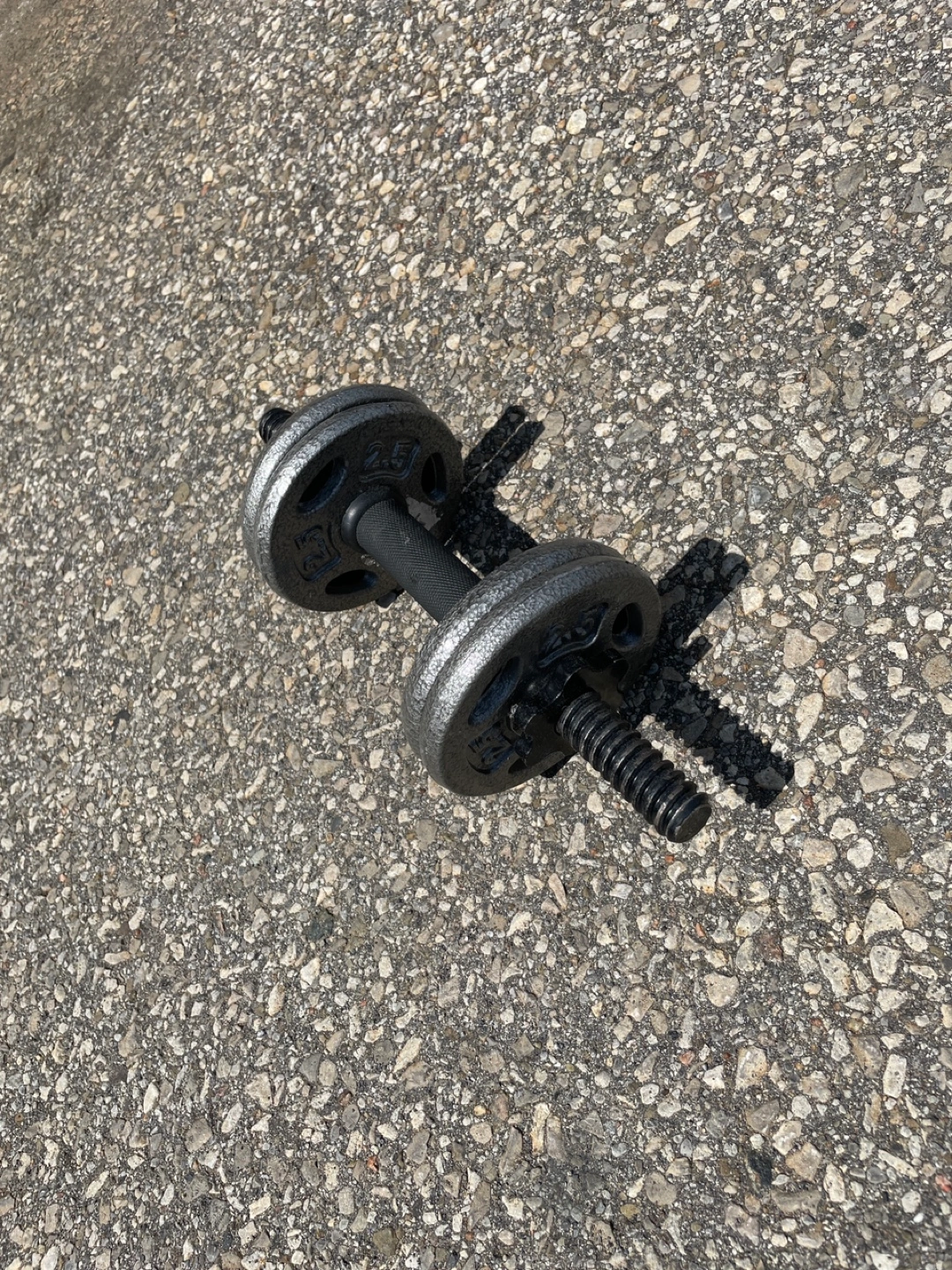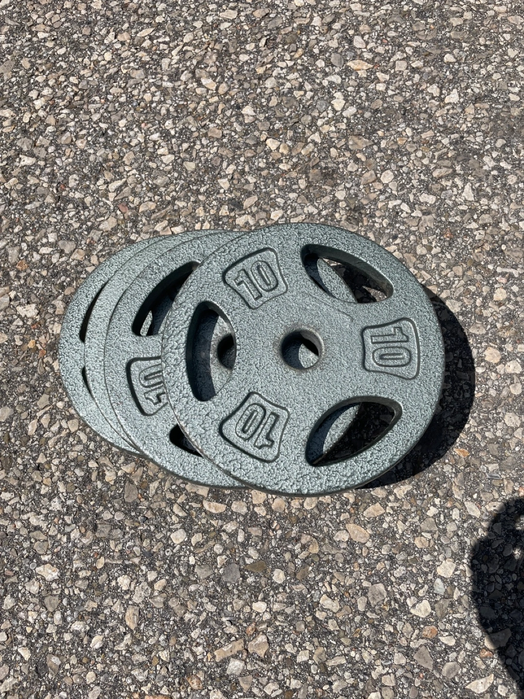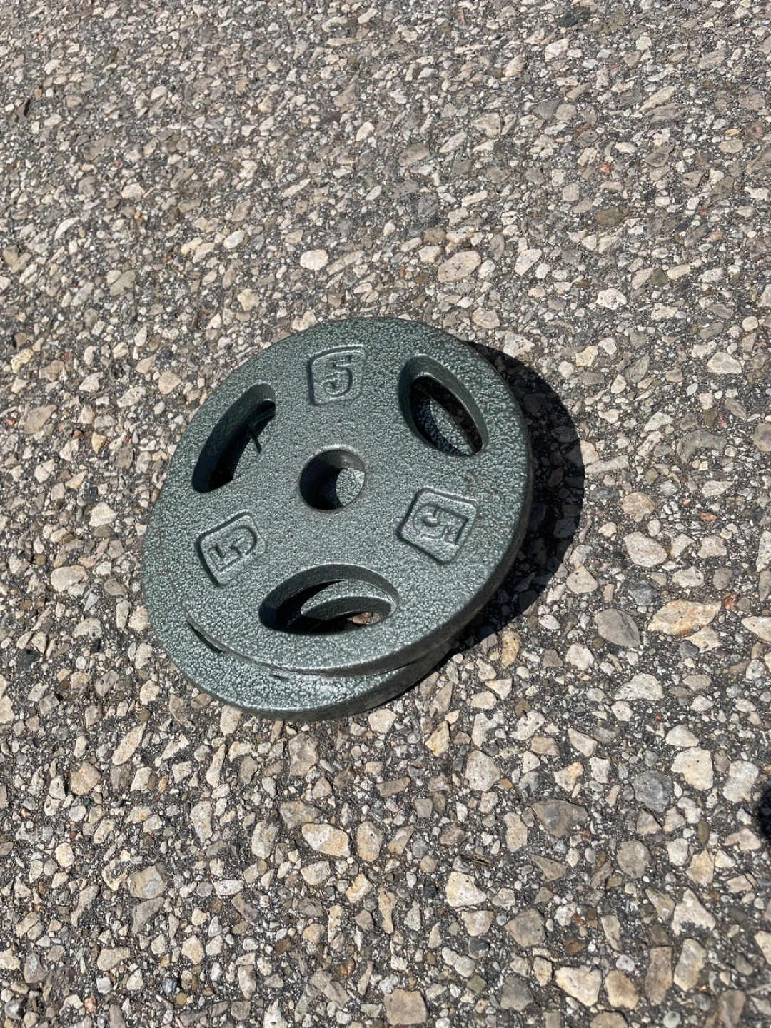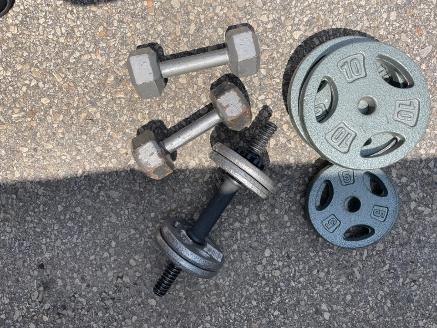 Selling a set of dumbbells and weight plates. Includes two 8lb dumbbells, two 5lb weight plates, and two 10lb weight plates. Good condition!