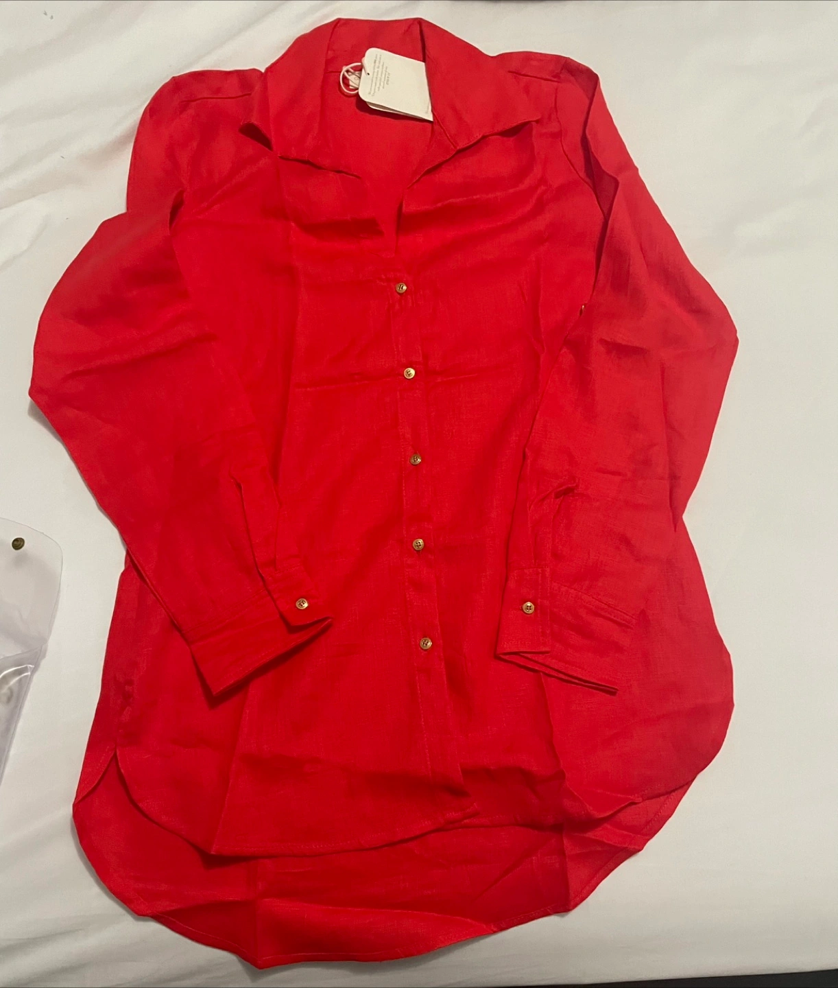 Here's a vibrant red long-sleeve button-down shirt! It appears to be in great condition and ready for a new home. The fabric looks lightweight and comfortable, perfect for layering or wearing on its own