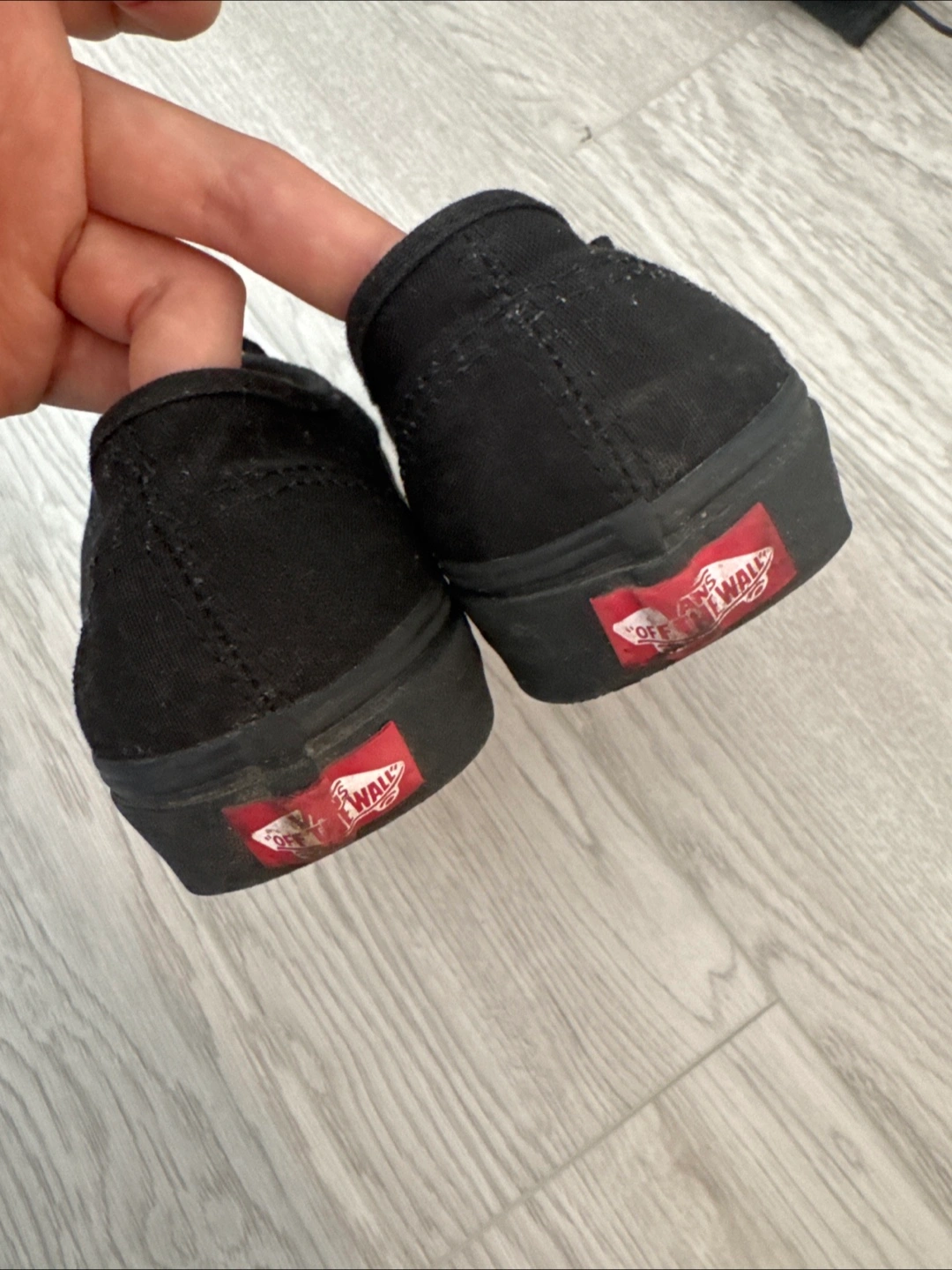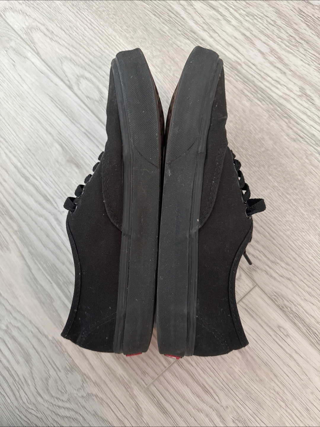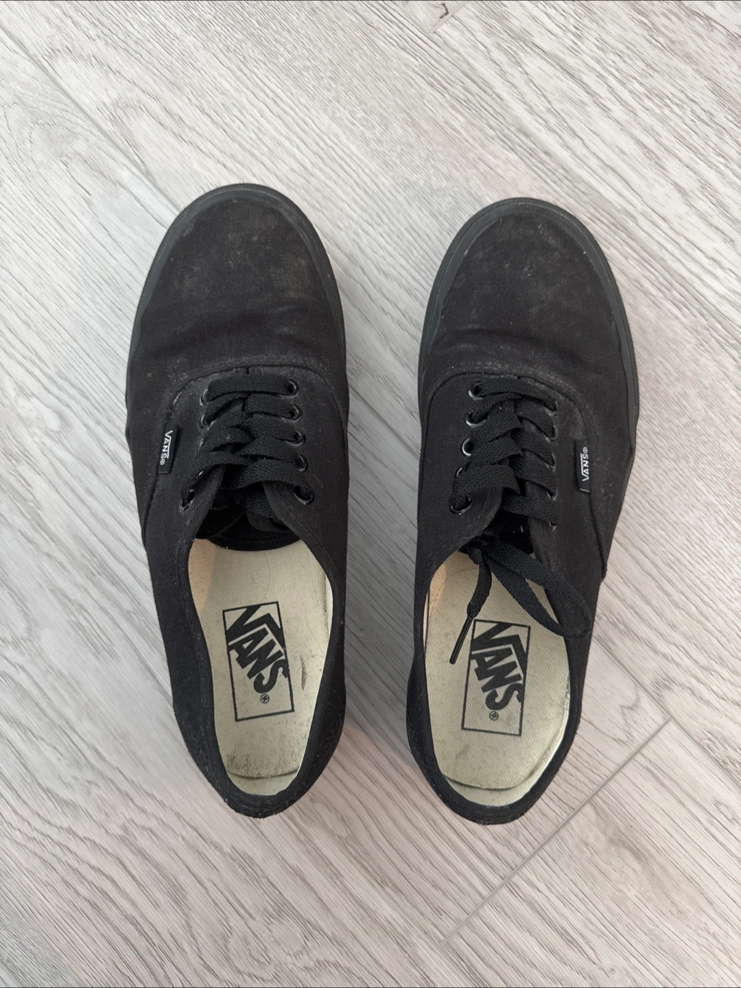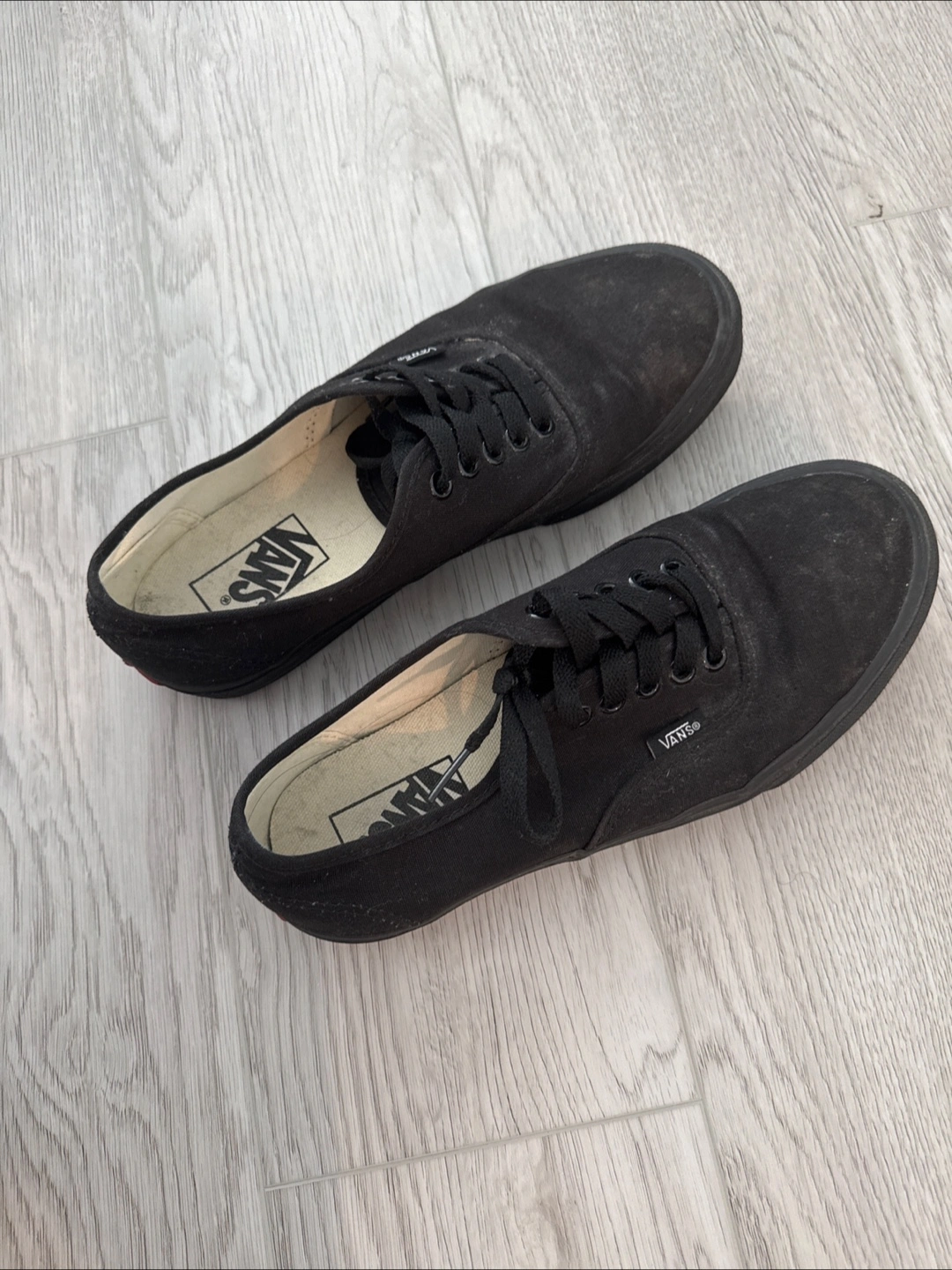 Selling a pair of black Vans Authentic shoes. They show some signs of wear, as you can see in the photos. Still lots of life left in them, just needs a good wash!