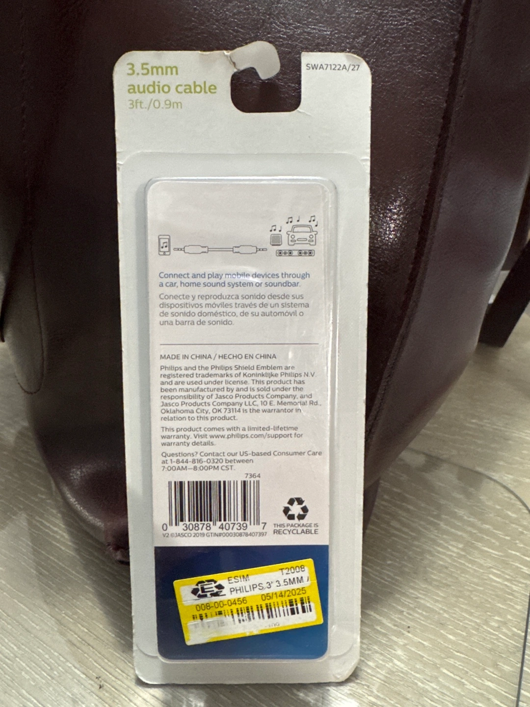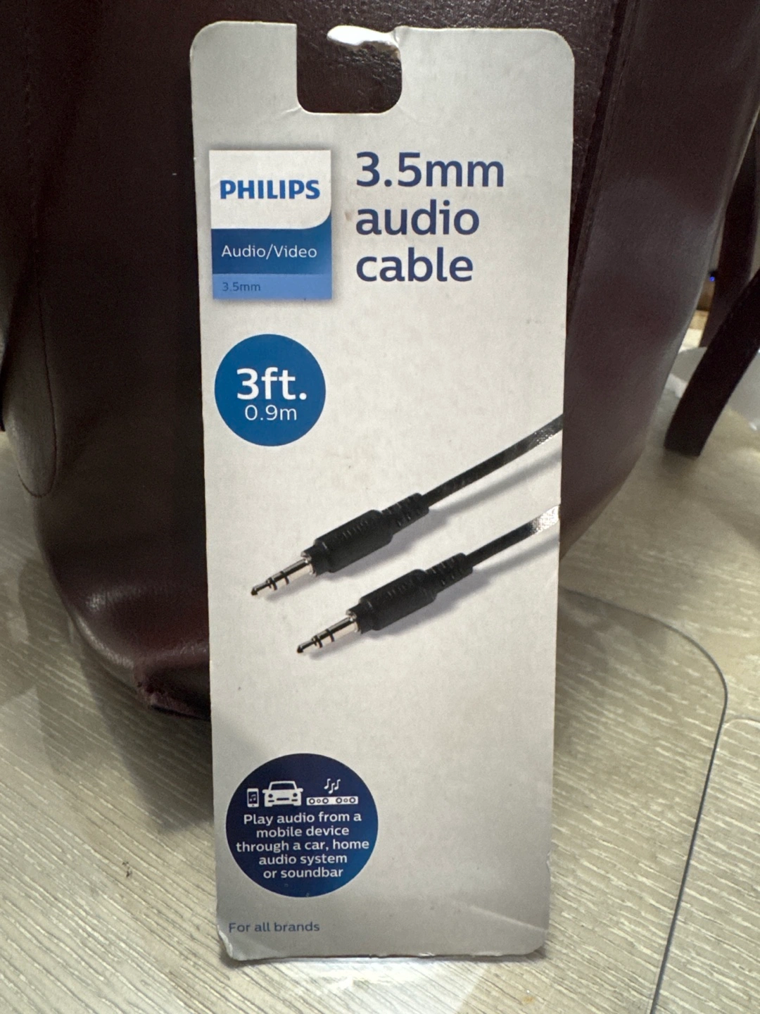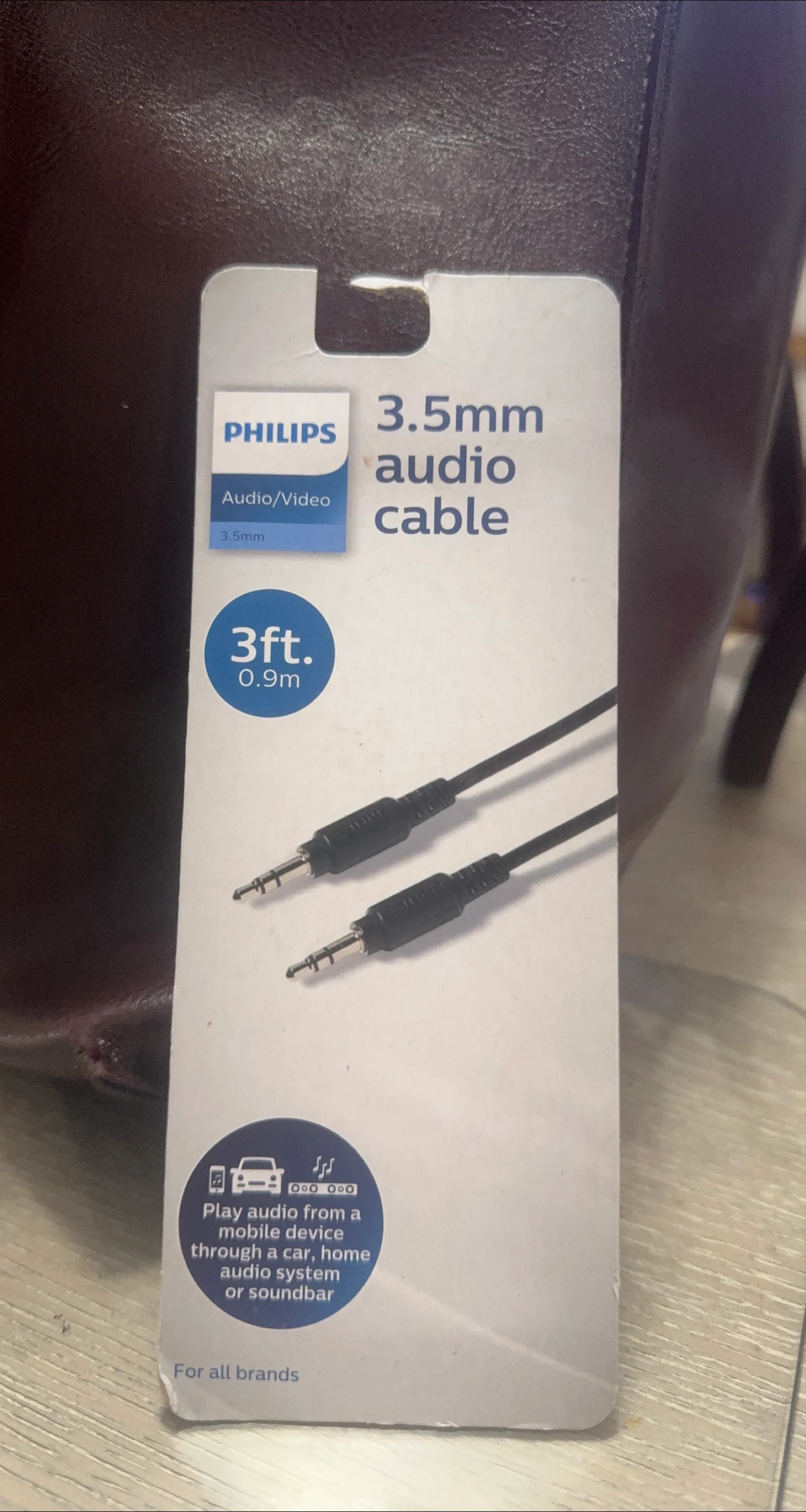 I'm selling a brand new Philips 3.5mm audio cable still in its original packaging! It's 3ft (0.9m) long and compatible with all brands. You can use it to play audio from a mobile device through a car, home audio system, or soundbar.