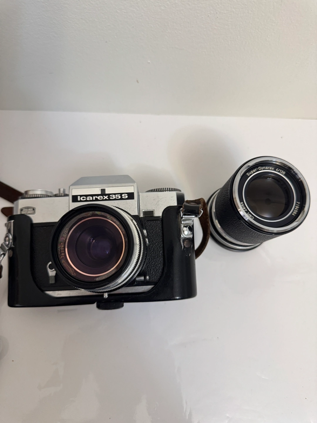 Selling a vintage Icarex 35 S film camera, complete with a Super-Dynarex 4/135 lens. It's a classic piece for any photography enthusiast or collector! The camera shows some signs of wear consistent with its age, but it's still a beautiful and functional piece of equipment.