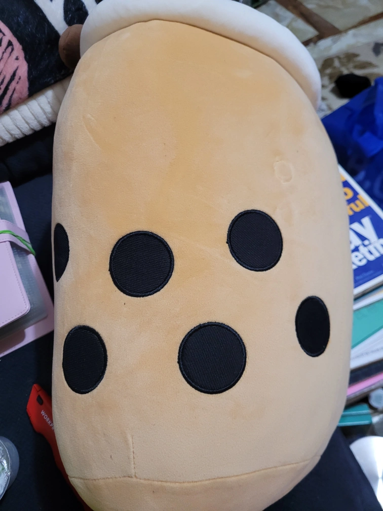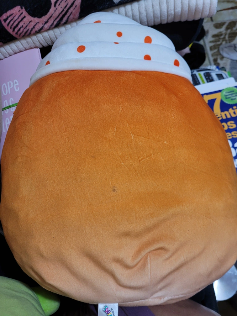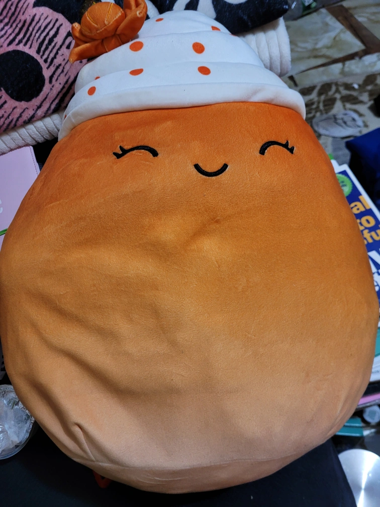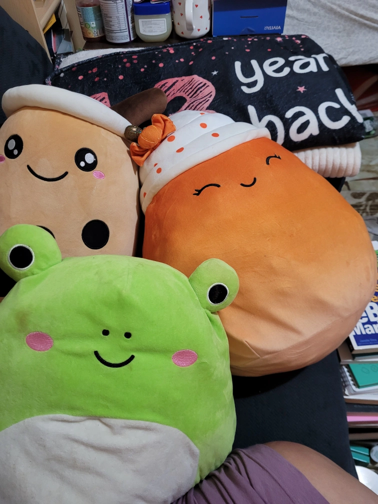 Sizes are 16-18"- frog and spiced pumpkin latte are squishmallow- Boba is non-brand but extremely similar. light stains and are machine washable, but in otherwise great condition.