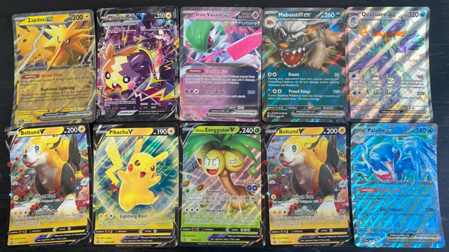 Selling a collection of Pokemon EX and V cards! Includes Zapdos EX, Morpeko V, Iron Valiant EX, Mabosstiff EX, Quaquaval EX, Boltund V, Pikachu V, Alolan Exeggutor V, and Palafin EX. Great for collectors or players! Jumbo cards only . First come first serve