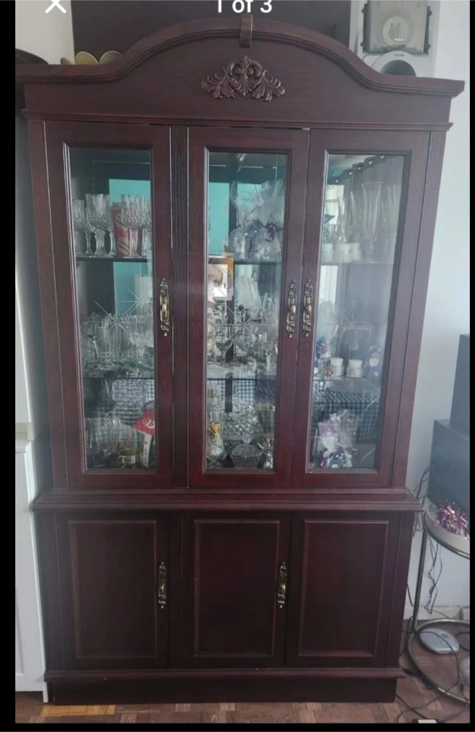 Selling a lovely wooden display cabinet. It features glass doors on the top section, perfect for showcasing your favourite items. The bottom part has closed cabinets for additional storage. It's in great shape and ready for a new home!