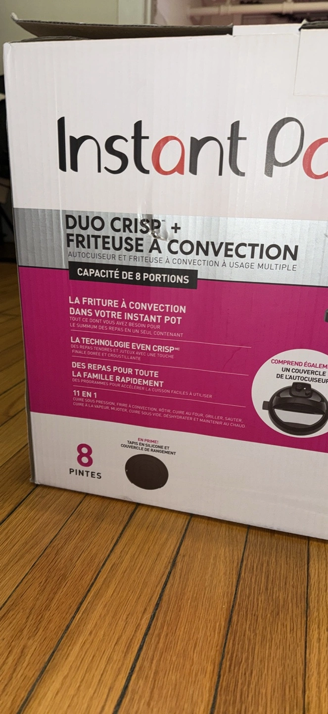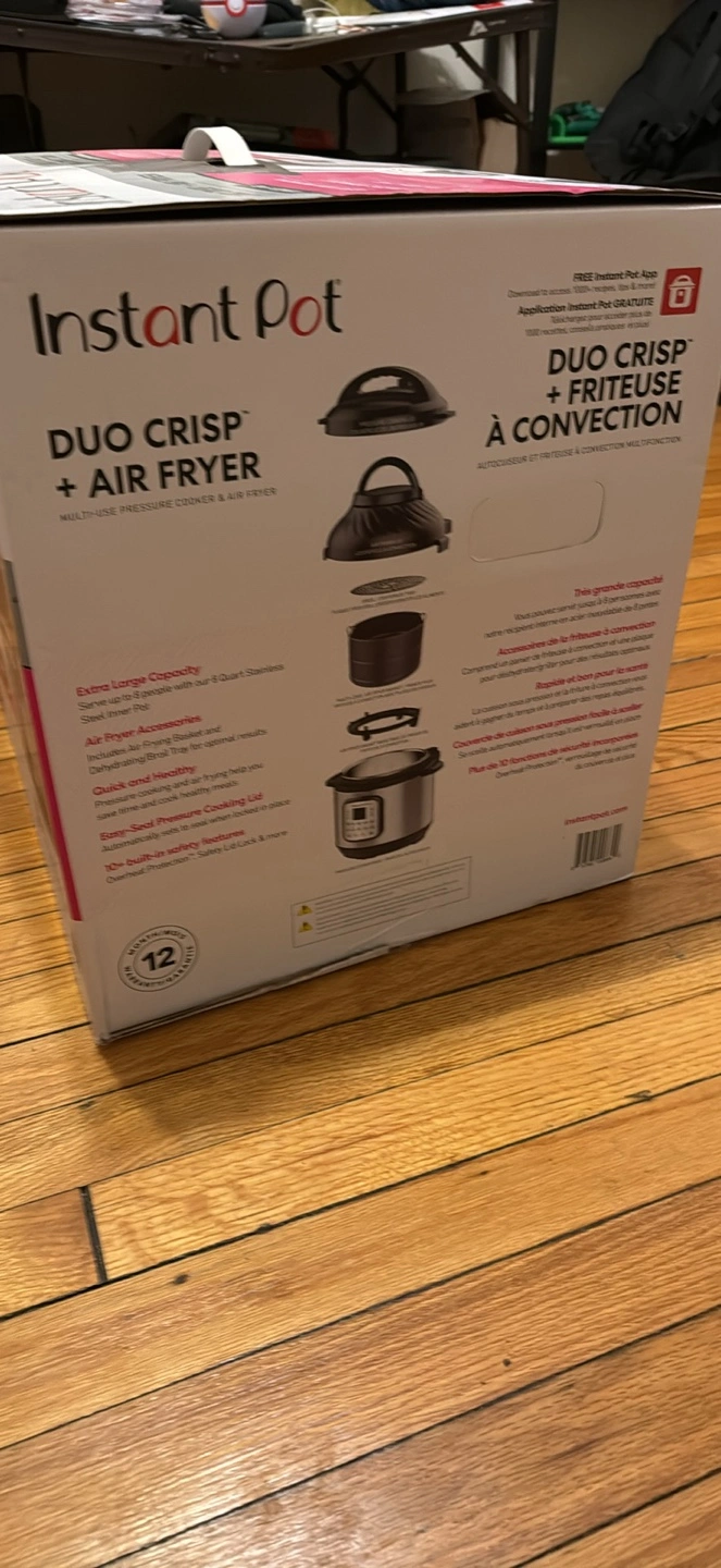 I'm selling an Instant Pot Duo Crisp + Air Fryer. It's a multi-use pressure cooker and air fryer that serves up to 8 people. It has Even Crisp Technology for tender, juicy meals with a golden crisp finish.