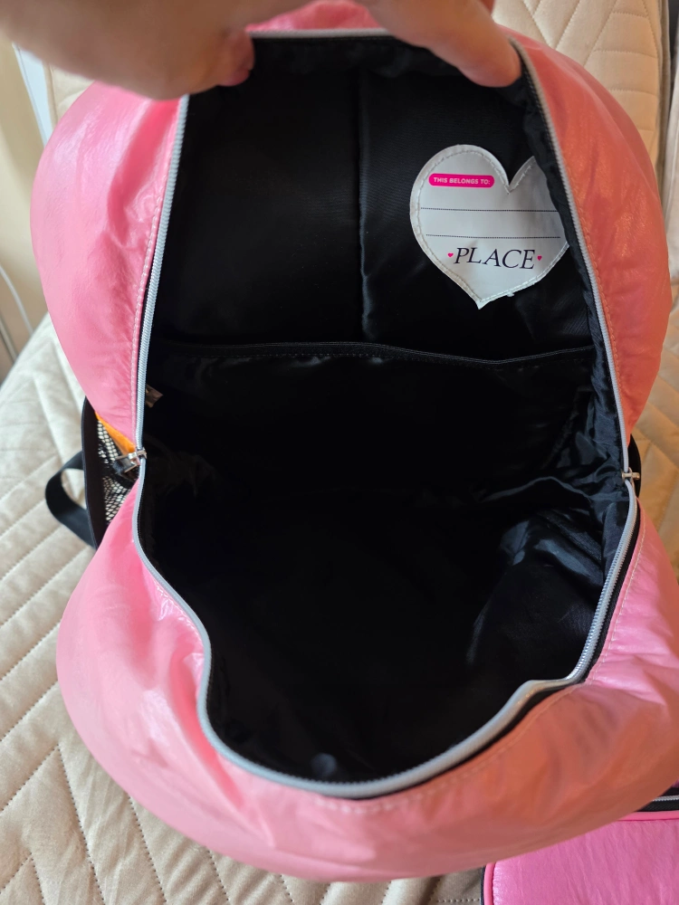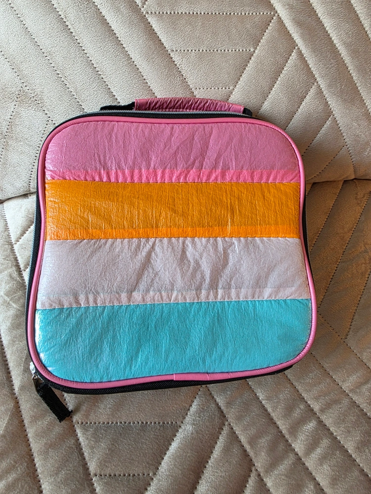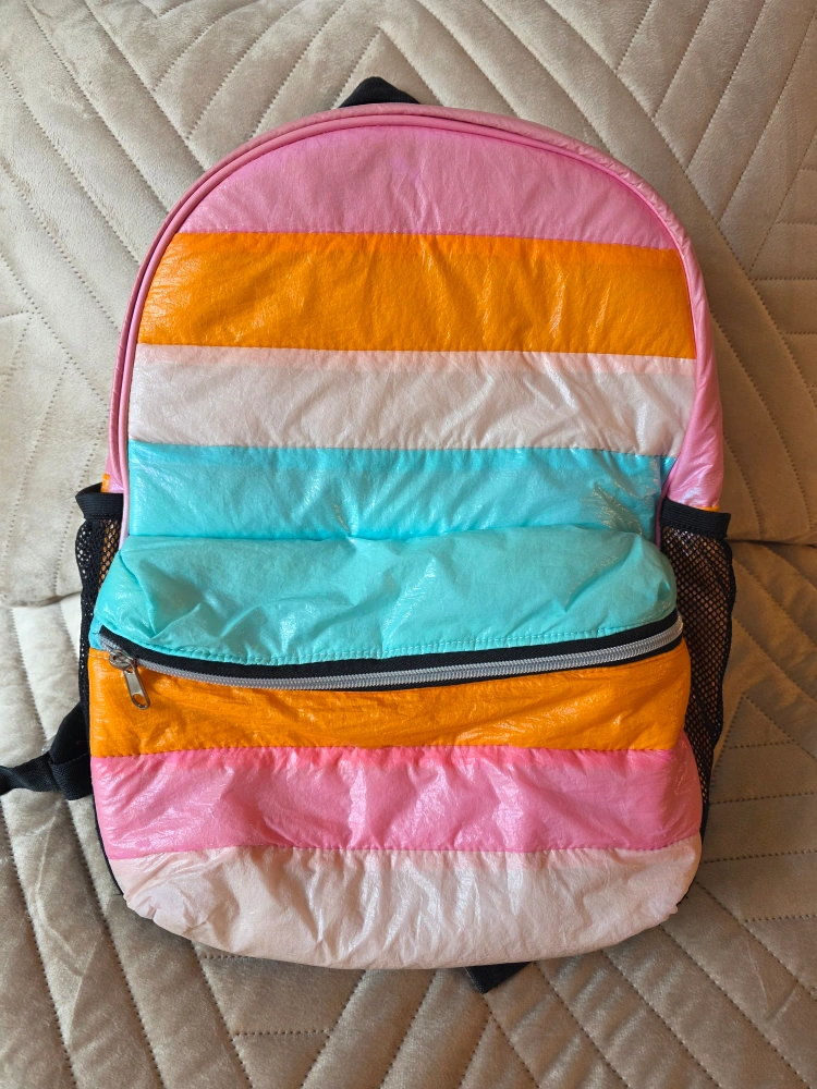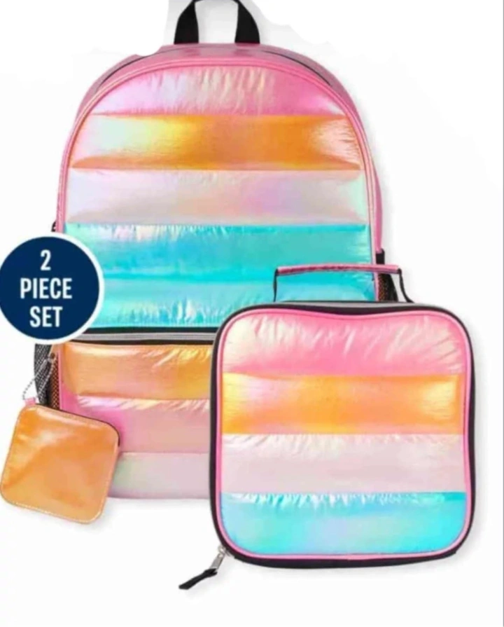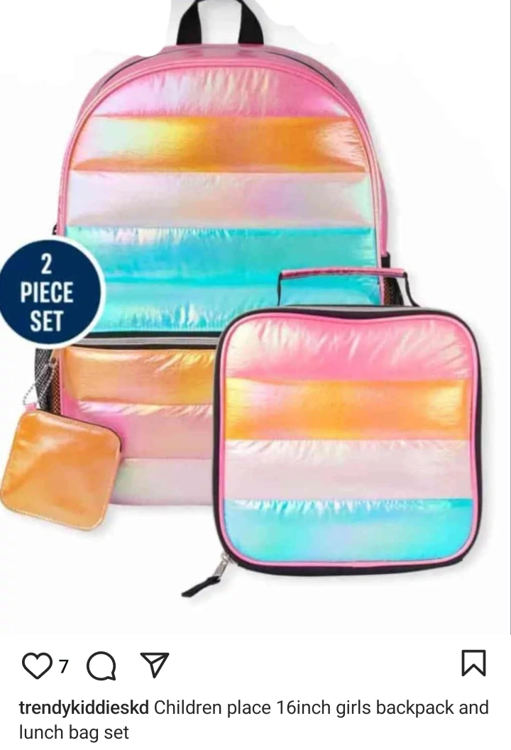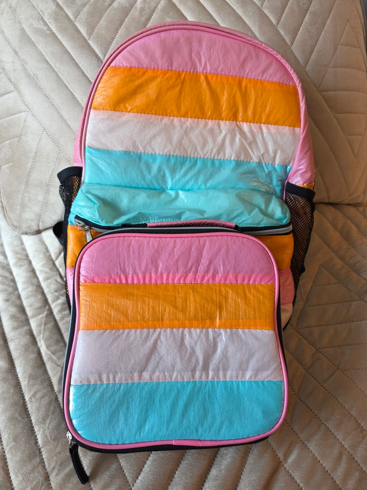This cute backpack and lunch bag are from The Children's Place. It is 16 inches and has a fun, colourful striped design. Perfect for school or travel!