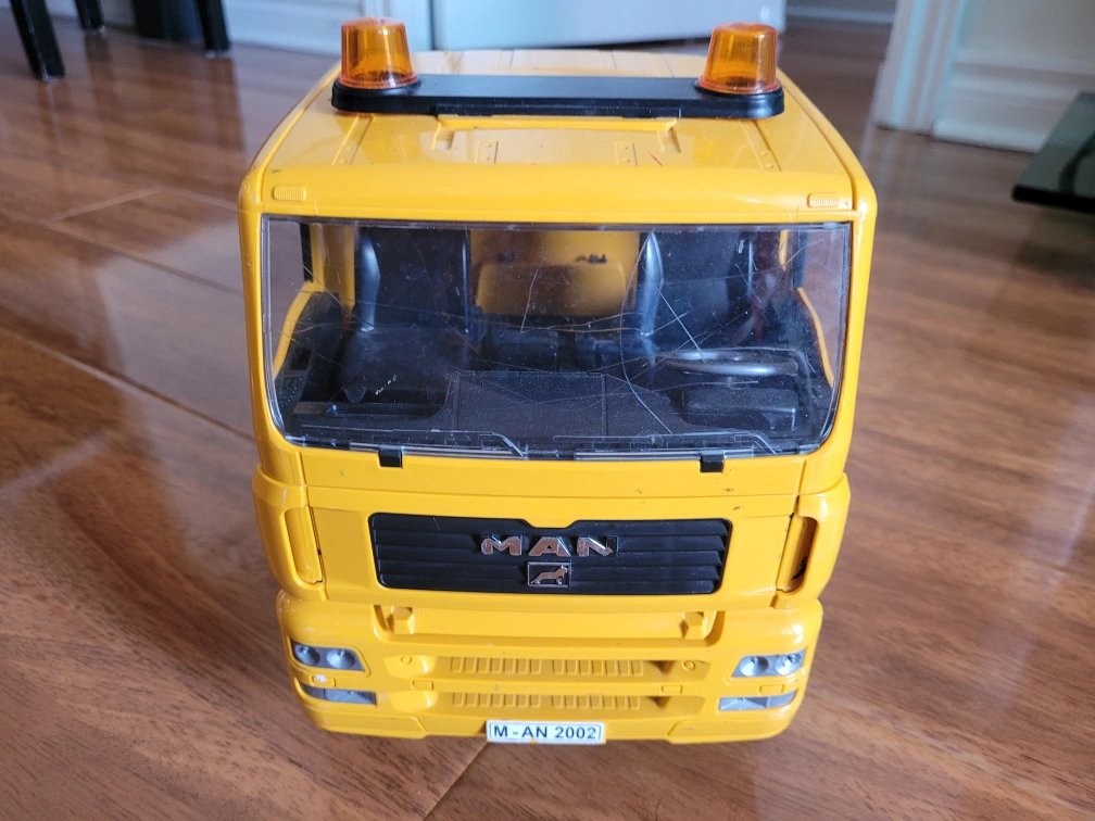 Selling a MAN tow truck in yellow. It's in used condition with some wear and tear. Great for kids who love trucks!