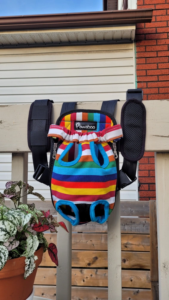 Pawaboo pet carrier backpack, perfect for taking your furry friend on adventures! It appears to be in good condition. One is a rainbow striped carrier, and the other is blue and black (Suitable for small dog/cat <5lb)